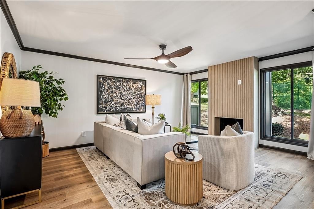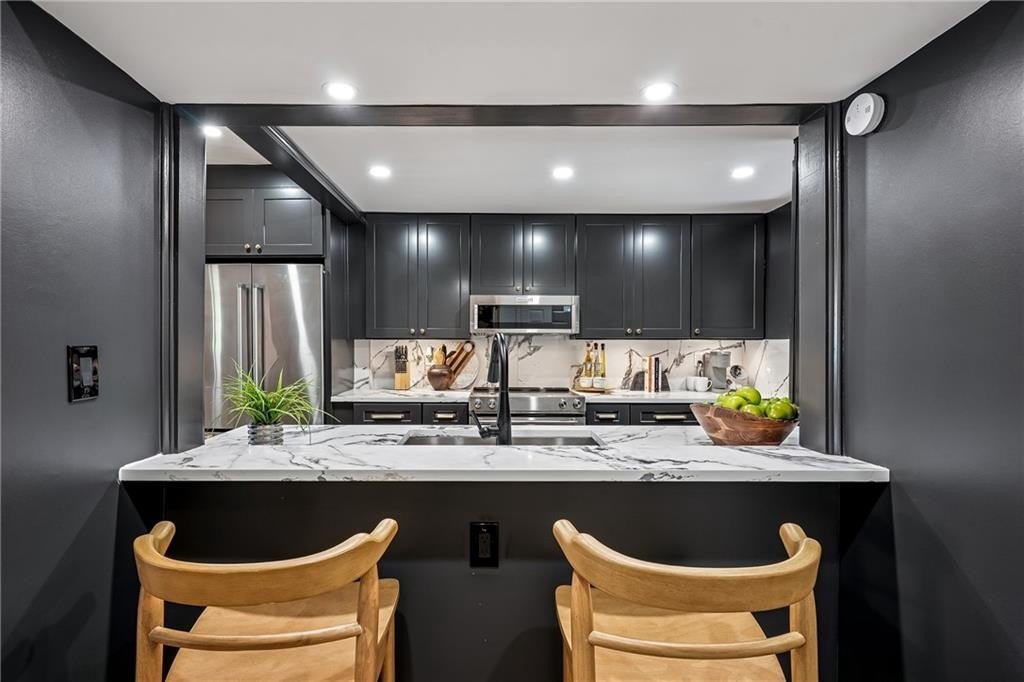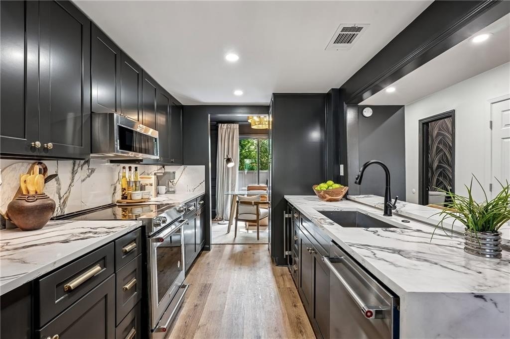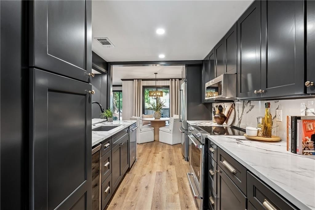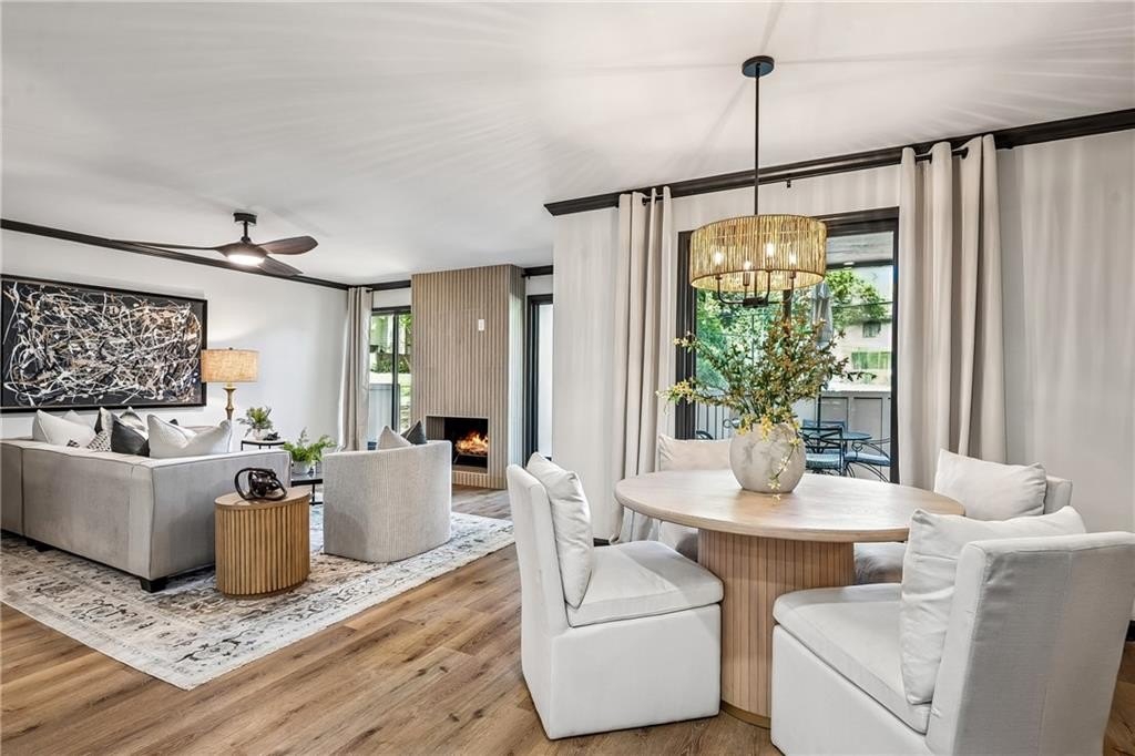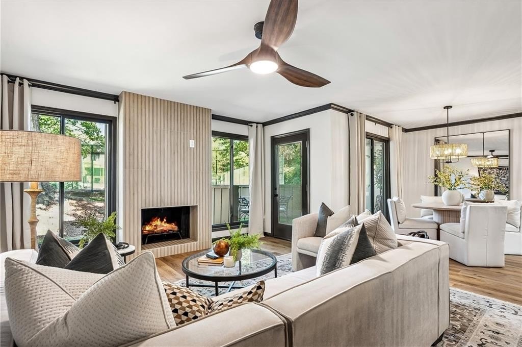 *Buyer Incentive* $5,000 in Closing Costs for offers accepted by 12/15 --Modern luxury meets comfort in this fully renovated end-unit condo by DrewGarkin Homes, LLC, a 5-star development team known for affordable luxury and modern elegance design. Ideally located in the sought-after East Cobb area, just minutes from Truist Park and seamless access to I-285/75, this home offers the best of Cobb County living! Tucked away as an end-unit, enjoy privacy and serene views of the pool and tennis court right from your window. Inside, this 3BR/2.5BA home features a fully open concept layout with natural flow from the living room to the kitchen and eat-in dining area. A custom design floor-to-ceiling fireplace wall serves as the focal point of the space-- equal parts cozy and captivating. The kitchen is outfitted with high-end KitchenAid appliances, sleek designer countertops, Delta touch faucet, beverage fridge, and new close cabinets throughout. Adjacent to the kitchen is a private patio and beautifully maintained green space with custom Precision Jet turf, perfect for entertaining or unwinding outdoors.