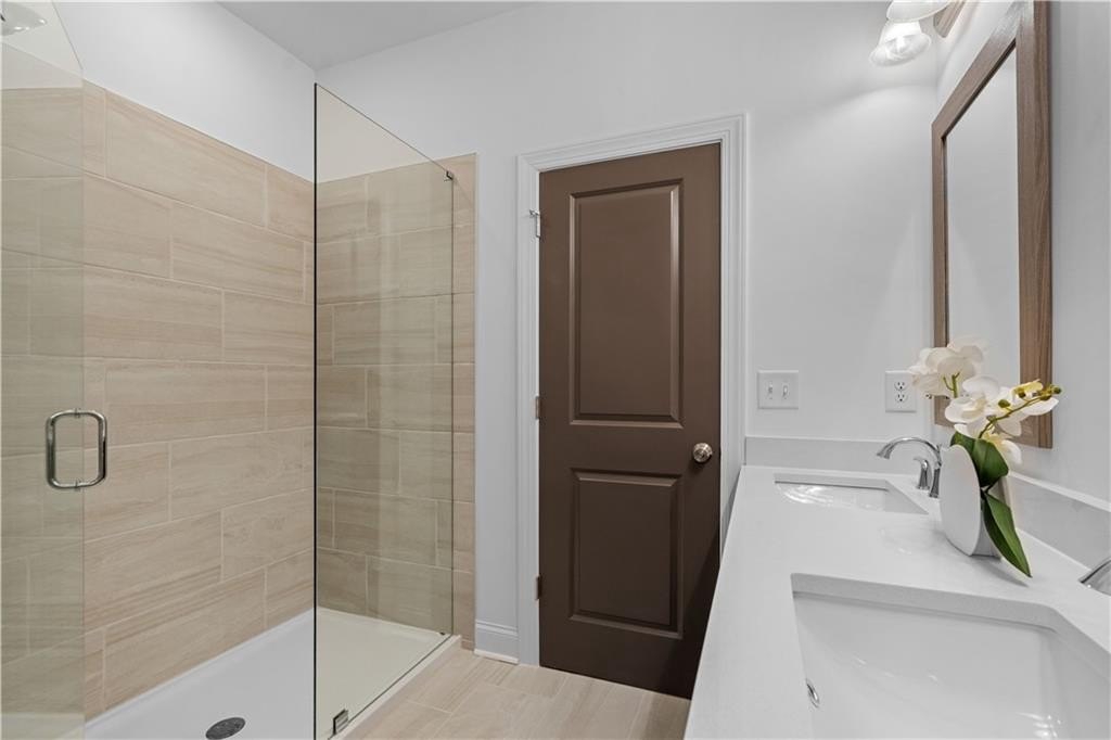 Upstairs, the Primary Suite includes a large walk-in closet and spa-like bath with double vanities and a walk-in shower. A secondary bedroom with its own private bath completes the top floor.