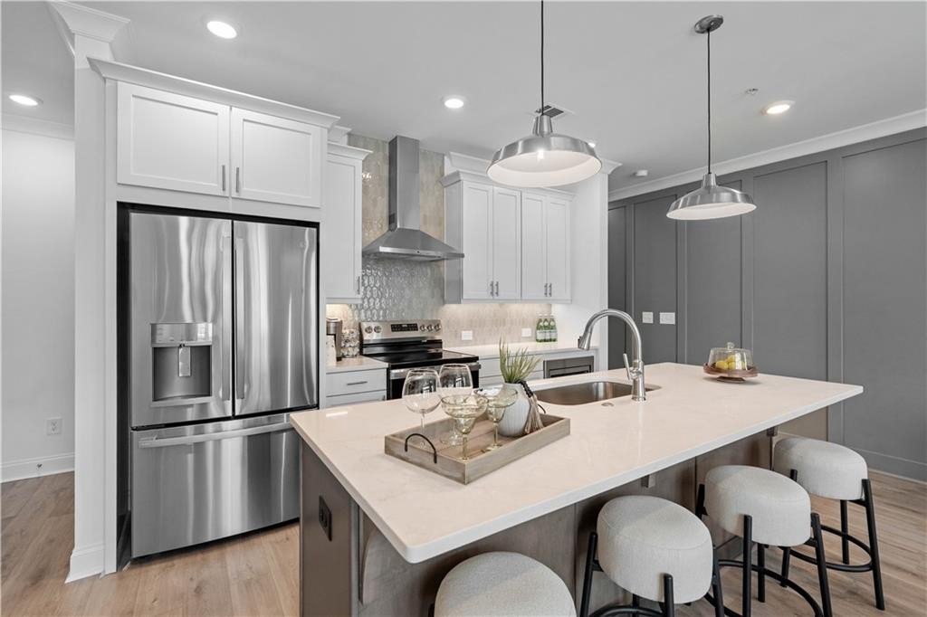 On the main level, enjoy an open-concept layout with a spacious family room, dining area, and a chef-inspired kitchen featuring 42” cabinetry, stainless GE appliances, tile backsplash, and modern lighting.