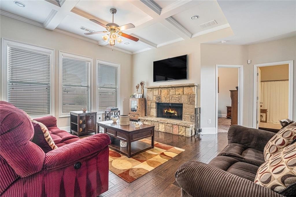 This 5-bedroom, 3-bath home offers space, style, and lifestyle in one perfect package. A brick front and welcoming front porch set the tone, while the three-car garage with an EV Vehicle charger add practical luxury. Step inside to coffered ceilings, LVP floors, and a stone fireplace that instantly draws the eye. The gourmet kitchen features double ovens, granite counters, stainless appliances, and a large island for cooking and entertaining. A main-level bedroom and bath provide private accommodations for guests or multigenerational living, and a flex/office space supports work-from-home or creative needs. Upstairs, a loft adds versatile living space, and the spacious primary suite boasts a spa-inspired bath, soaking tub, separate large shower, double vanity and daylight walk-in closet. Three additional bedrooms and a full bath complete the upper level.