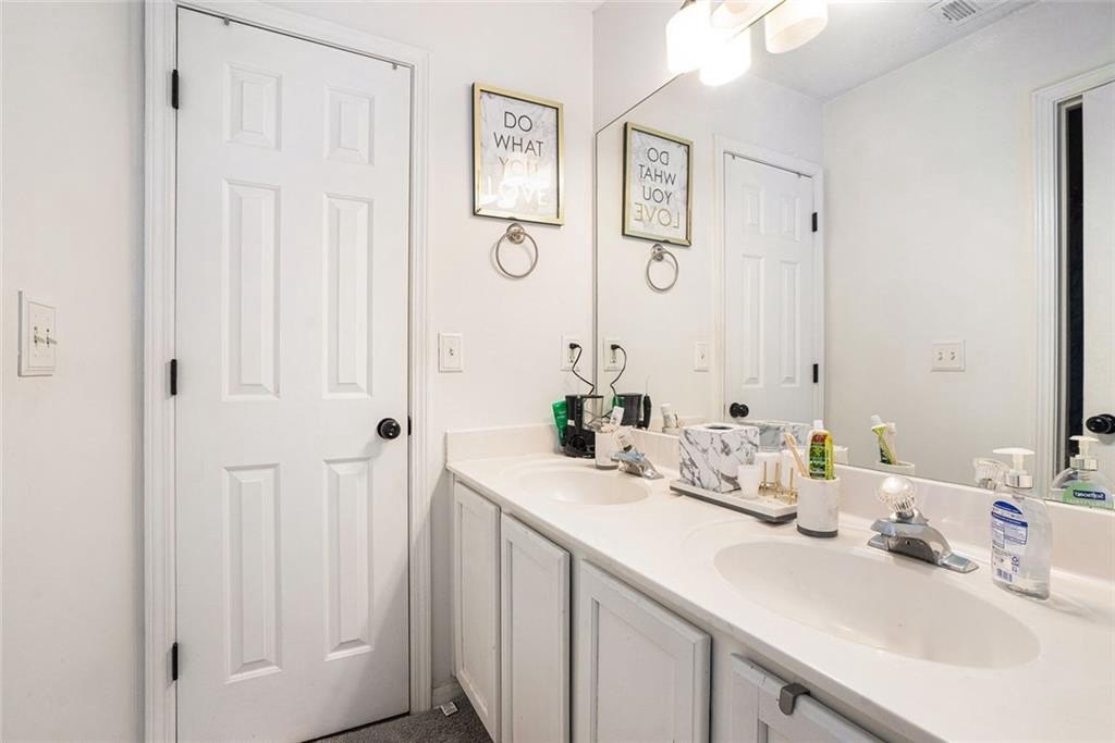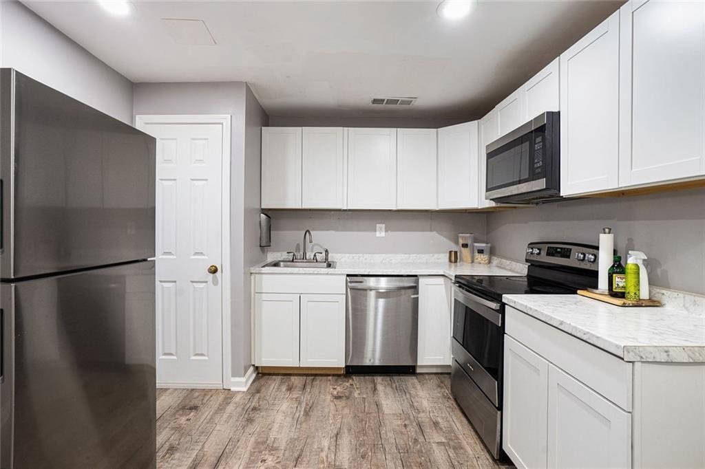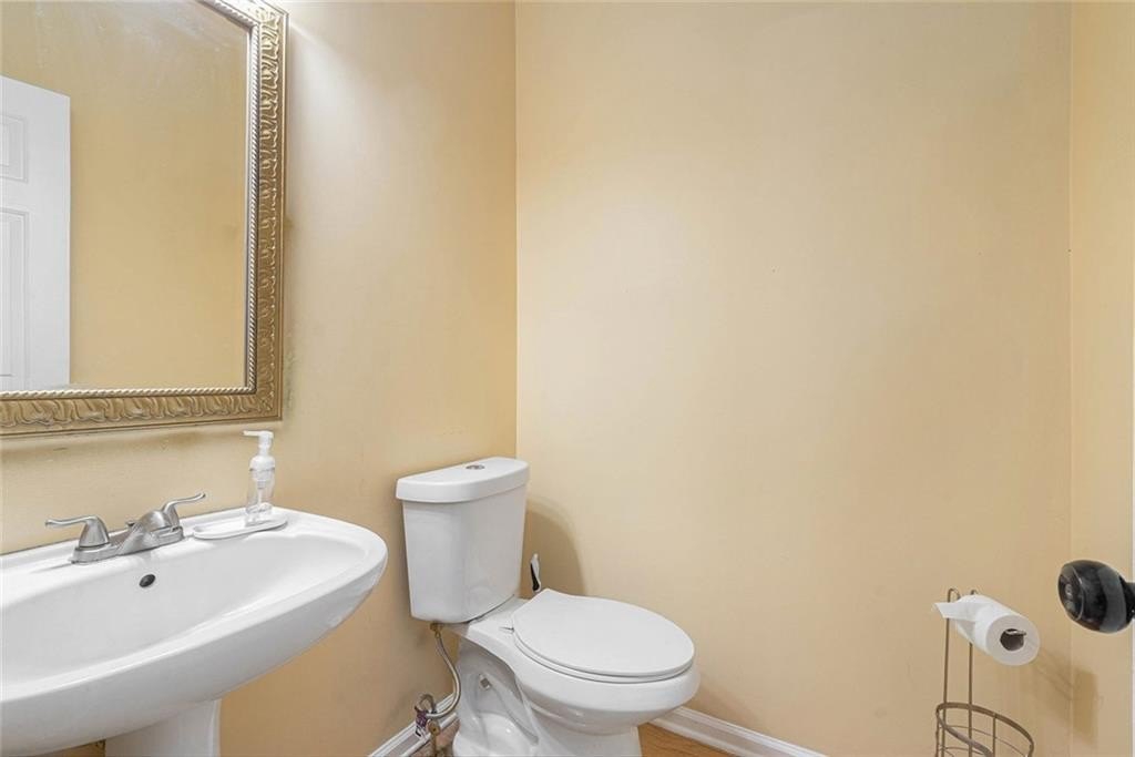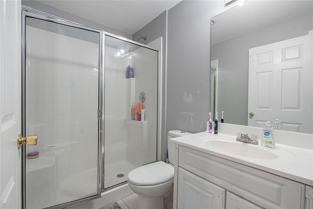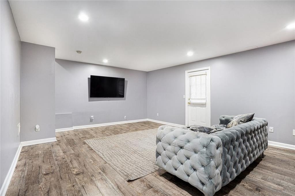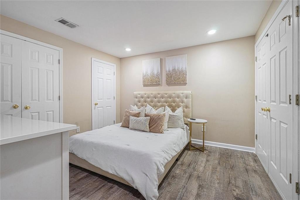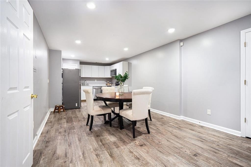 White painted brick on the exterior with black trim provides immediate curb appeal for this large home. Finished basement with bedroom, full bath, full kitchen exterior entrance, and extended patio with a walk around from the front. Upon entry you will find a wide hallway flanked by a swing room with bay window, which can also be used as a bedroom. The kitchen features white cabinets, granite counters and backsplash, a breakfast bar and a breakfast room. The separate dining room has an open view to the 2-story family room. The main floor features a modern light colored luxury vinyl plank throughout. The large back deck has composite deck boards and stairs to the backyard. Upstairs you will find a lovely view to the 2-story great room, the primary suite, two additional bedrooms and 2 full baths. The primary suite features a trayed ceiling, and bathroom with a double vanity and separate shower and bath. No carpet upstairs. Great location. Swim/Tennis community.