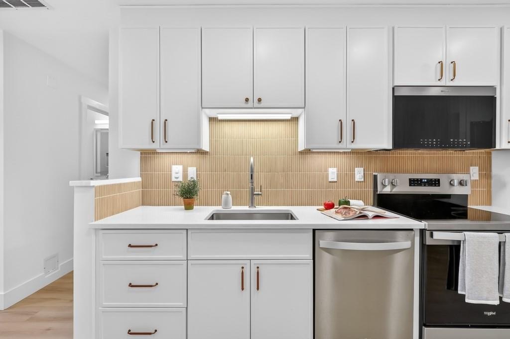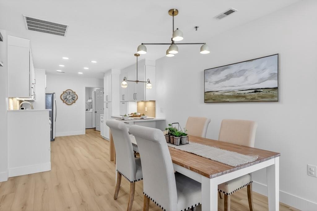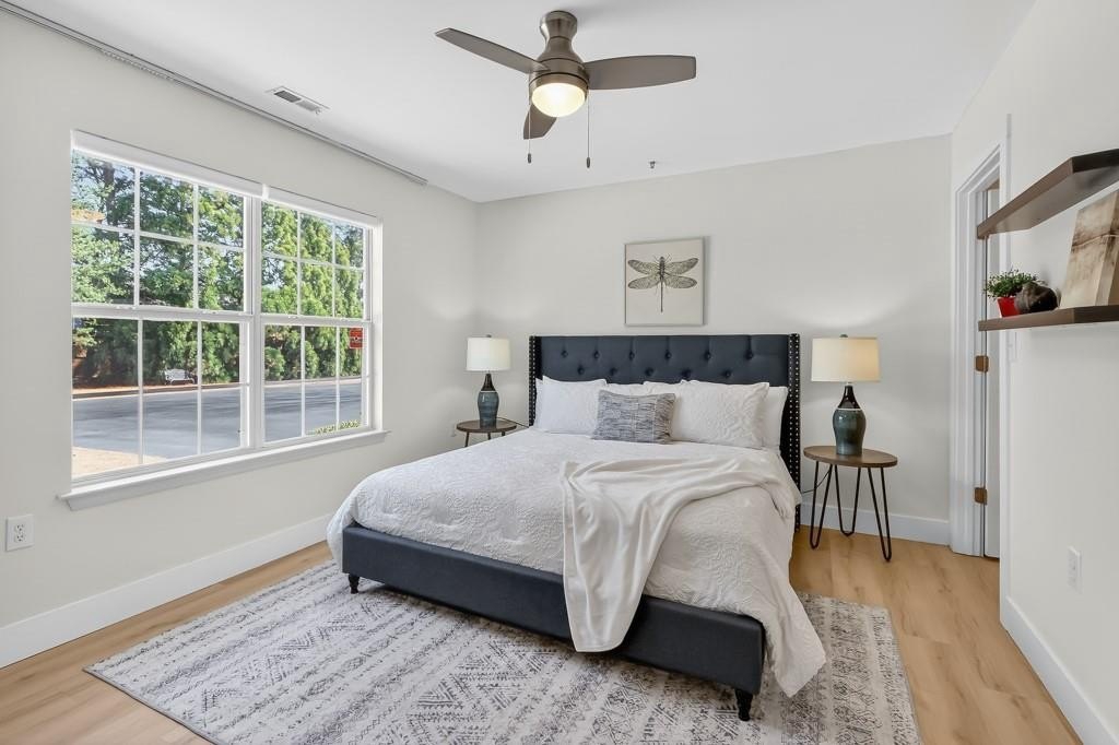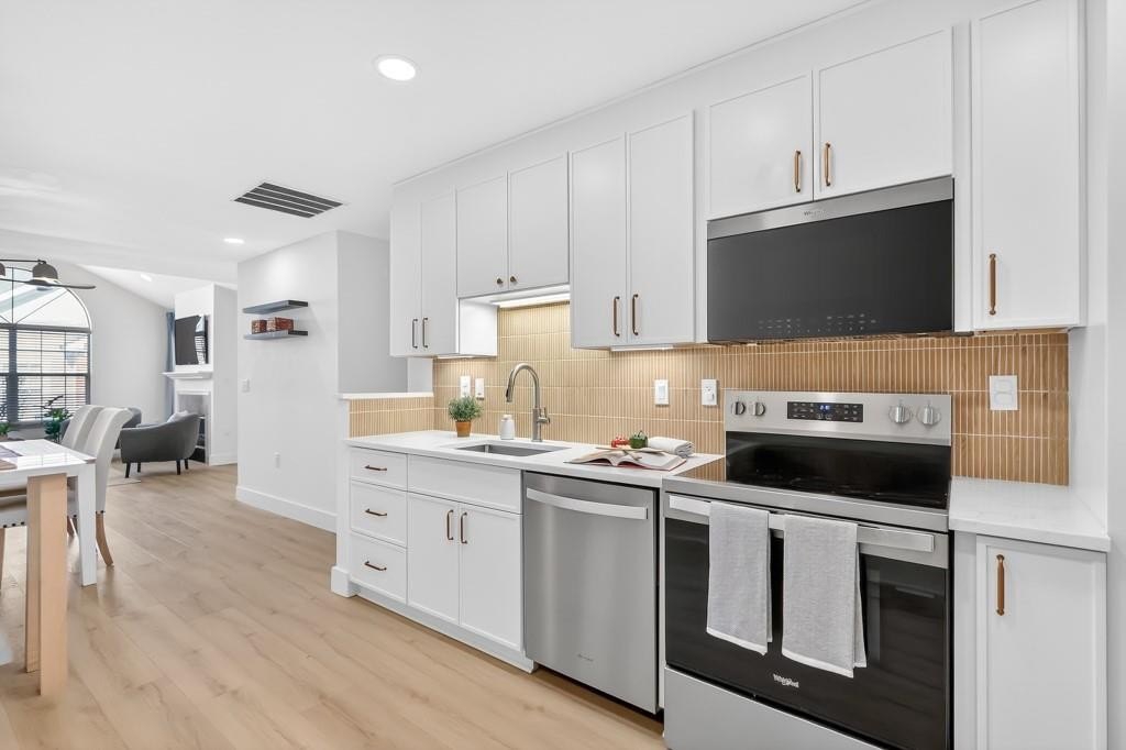 This home delivers serious WOW factor with a complete top-to-bottom renovation and true move-in ready condition. Located in the Alpharetta Garden District less than 2 miles from Downtown Alpharetta, the setting offers both convenience and charm. The open concept layout is ideal for entertaining, with the kitchen and dining area flowing into the fireside family room. The fully remodeled kitchen features white shaker cabinets with soft-close doors and drawers, quartz countertops, stainless steel appliances including refrigerator, dishwasher, electric range, and air fryer/microwave combo, plus thoughtful upgrades like hard-wired under-cabinet lighting with motion sensors, a built-in pantry cabinet with pull-out drawers, and USB outlets. The spacious primary suite includes a large walk-in closet and a beautifully renovated bath with a custom vanity, quartz counters, lighted mirror, and a new tiled shower with rain head and built-in bench. The secondary bath is also fully updated with new vanity, lighted mirror, and custom tile surround with a new bathtub. Additional upgrades include wide-plank LVP flooring throughout with no carpet, smooth ceilings, fresh paint, and all new lighting with added recessed lighting in the main living areas. The two-car garage offers ample storage, and the private fenced patio is perfect for enjoying a spring afternoon. The neighborhood pool and clubhouse are just steps away. Ideal for an empty nester looking to simplify, a young couple seeking walkability and low maintenance living, or a single professional who wants convenience without the upkeep of a detached home. Pride in ownership definitely shows in this meticulously-maintained home! Honesty a RARE find!