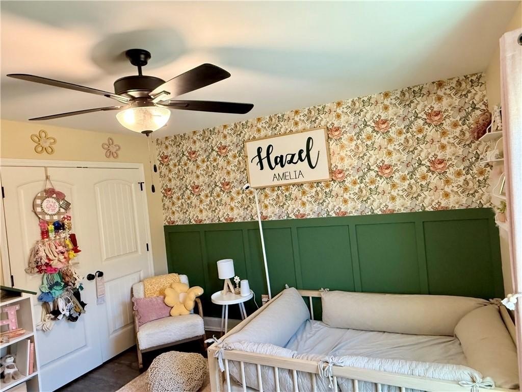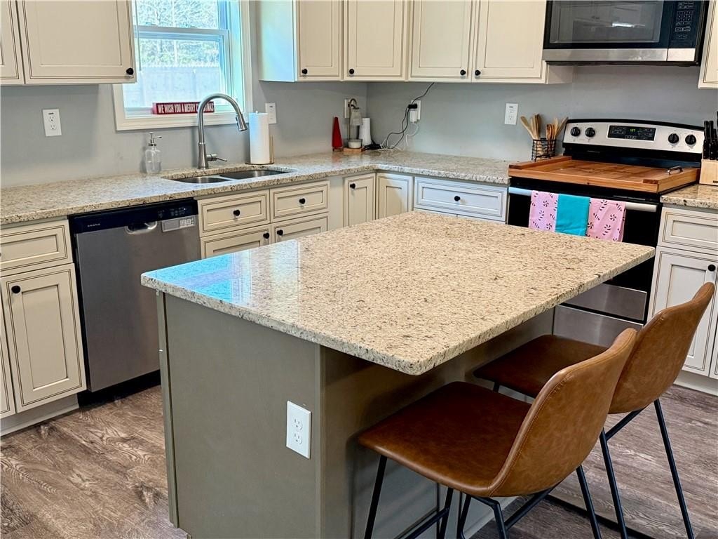 The kitchen has beautiful upgraded white cabinetry, stainless appliances, a breakfast bar, kitchen island, and is open to the great room. In addition, while in the kitchen you can look at the private fenced yard, that is perfect for children, family gatherings, and so much more.