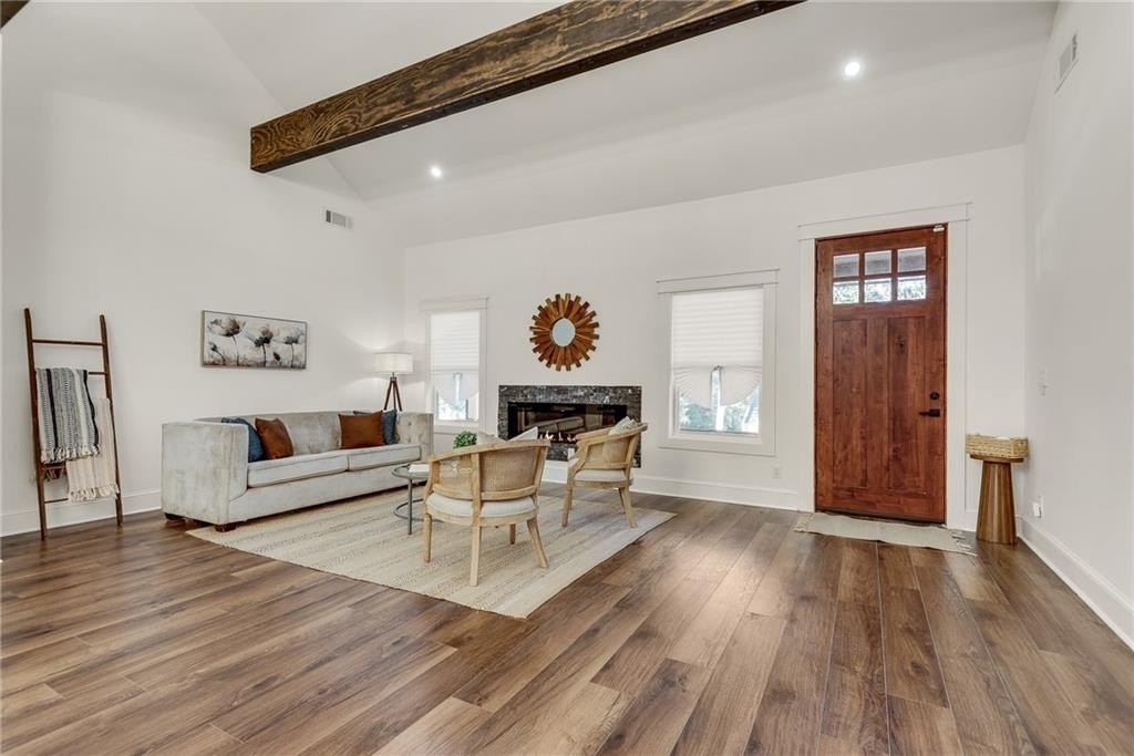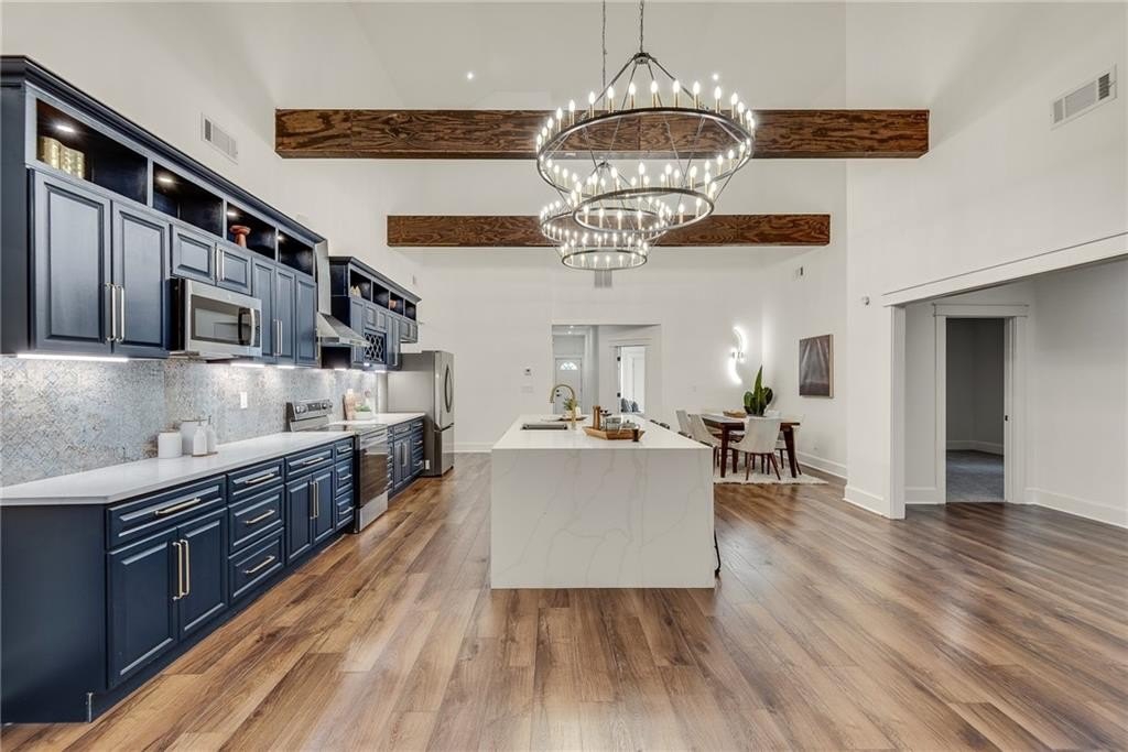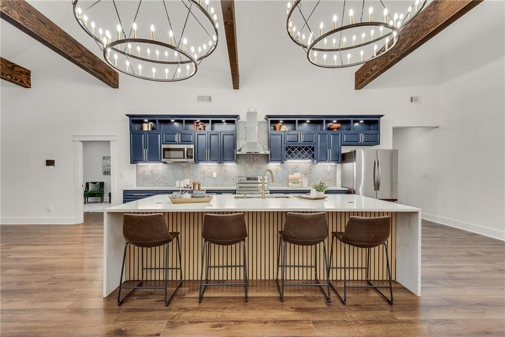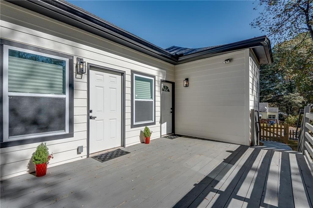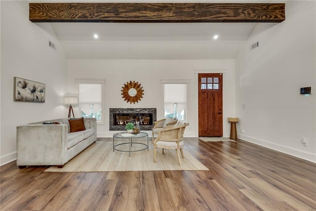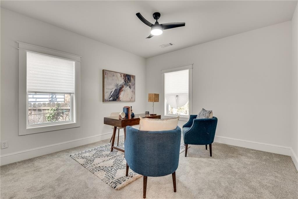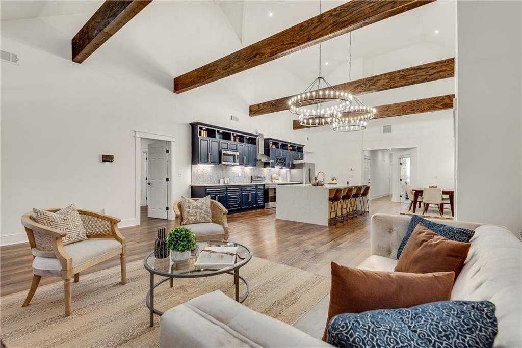 Beautiful New Construction in Historic Oakland City / West End on a corner lot with a rare 2 car garage, not far from the Lee and White Development with several breweries, restaurants, retailers and a food hall. This 4 Bedroom, 3.5 bathroom has the mix of modern and traditional style and is the perfect place to call home. The inside living/dining/kitchen features an open floor plan with clean lines, modern design and finishes, 20' vaulted ceiling in the kitchen/dining area with exposed wood beams. There are 9 foot ceilings in the rest of the home. You will love the built in electric fireplace in the LR on those chilly nights, plenty of light throughout the home and LVPF flooring in the front portion of the house. Enormous kitchen island that can seat 5 guests, quartz counter's, double stainless sink, and Point Pod countertop pop up outlets. Custom blue cabinetry add to the charm of this kitchen, all stainless appliances, under cabinet lighting, open shelves/wine rack, and plenty of designer lighting including two Wagon Wheel Farmhouse Chandeliers. The dining area is right near the kitchen, large pantry in the hall along with the half bath with designer tiles, large laundry room with separate sink and front loading washer/dryer. The large BR at front of home is a 2nd owners suite or guest suite with plenty of light, large closet, private bathroom with oversized shower/bench seat/tile floors with porcelain walls and dual shower heads. The two secondary bedrooms( wall to wall carpet) have double closets, designer ceiling fans, in the hall is the 3rd full bath with tub/shower combo and designer fixtures and dual vanities. You will love your primary bedroom, large walk in closet with built ins, fabulous en suite bath with dual vanities, oversized shower, dual shower heads, separate soaking tub, beautiful gold fixtures and elegant lighting with private water closet. There is a large deck off the primary bedroom ( also access to it from the hallway) to enjoy your morning coffee on which overlook's a fenced in backyard. The attached 2 car garage is located on the side of the home with plenty of space for two large SUV's. Get into this new construction in the West End which is "happening" now with some major investments coming soon!!