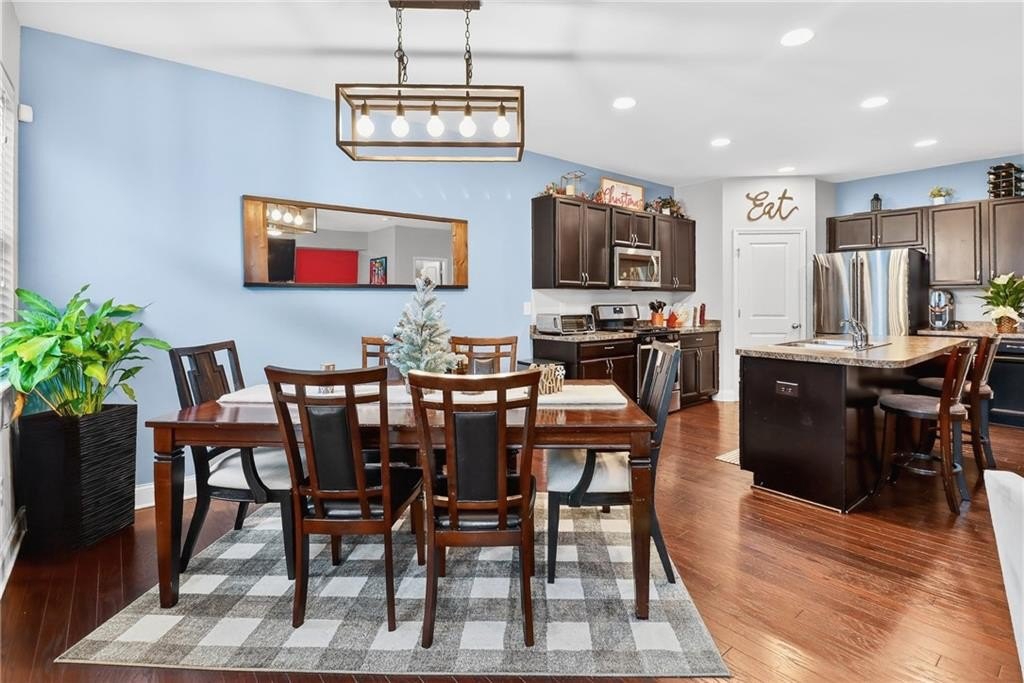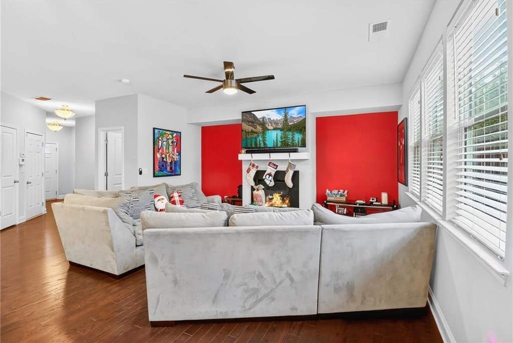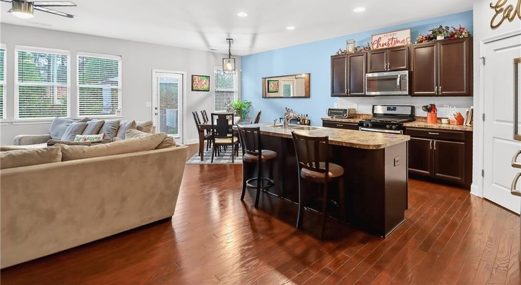 The main level boasts gleaming hardwood floors throughout, creating a warm and inviting atmosphere. Enjoy an open-concept kitchen and family room, ideal for entertaining. The kitchen offers nicely stained cabinets, stainless steel energy-efficient appliances, a gas range, a roomy island, and a walk-in pantry with ample storage.