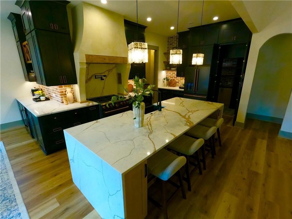 The heart of the home is the stunning vaulted great room with custom beams and a cozy fireplace. It flows right into the gourmet kitchen, where a massive island, premium appliances, custom cabinetry, and a hidden walk-in pantry make cooking, entertaining, and hosting feel effortless. The dining room adds an elegant touch and includes a stylish bar area that’s perfect for gatherings.
