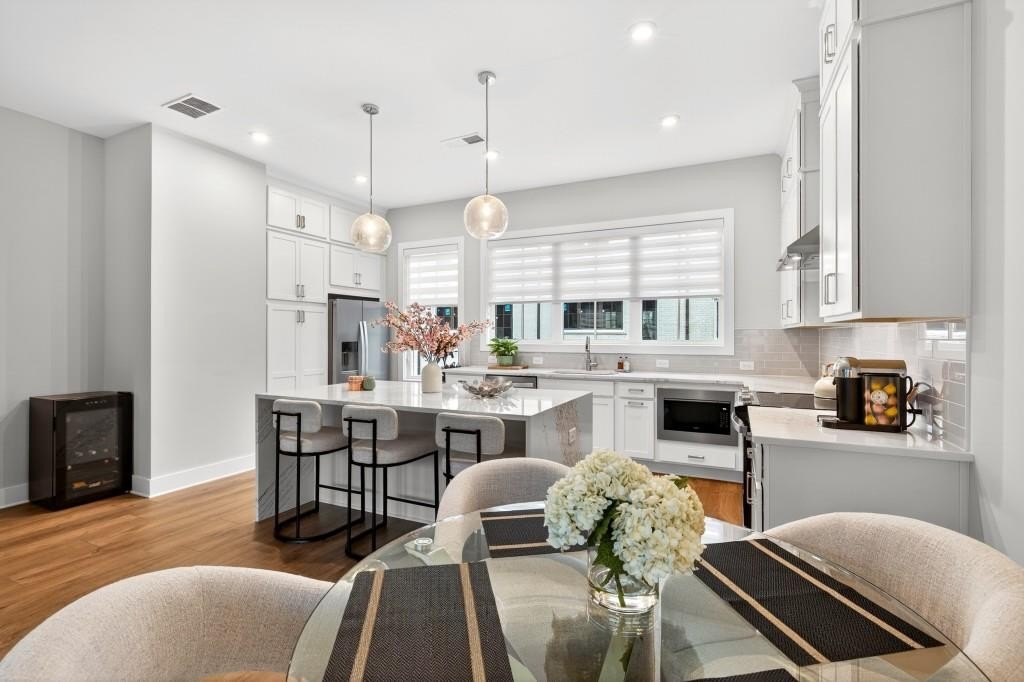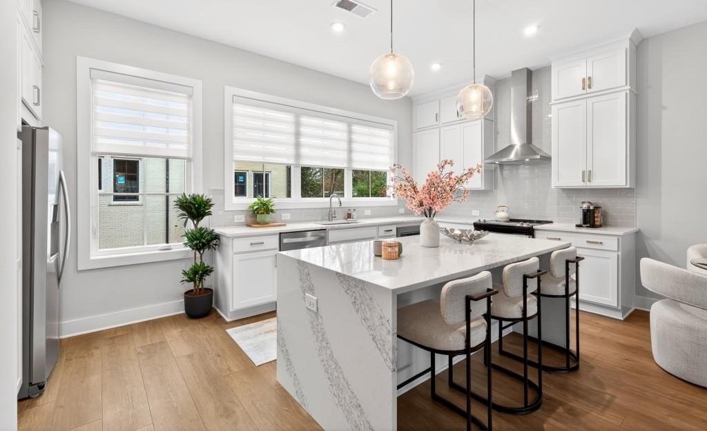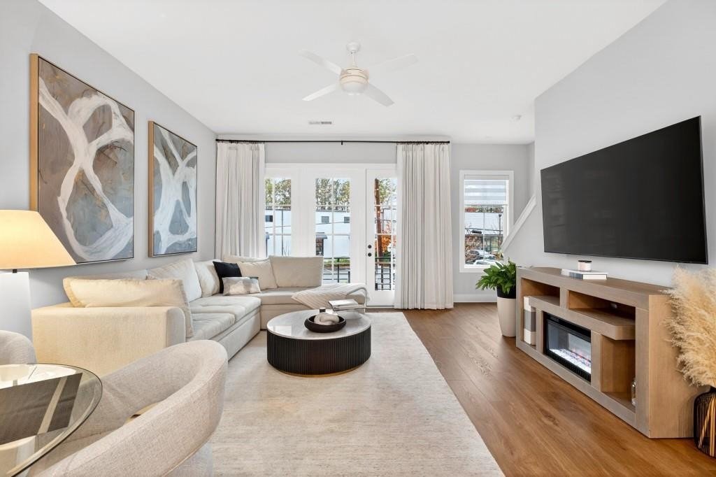 MOVE IN READY! INCLUDES UPGRADES-WATERWALL COUNTERTOPS, CEILING HEIGHT CABINETRY, CUSTOM DRAPERY, REFRIGERATOR, WASHER AND DRYER, BATHROOM MIRRORS, DESIGNER FANS IN ALL BEDROOMS. Beautifully appointed three-bedroom townhome located directly across the street from restaurants and just moments from the shops at Dresden. Featuring three bedrooms and three full baths, this home offers an expansive open-concept layout with a generously sized kitchen, large island, and excellent natural light. The lower level welcomes you with an inviting foyer and a private bedroom with an attached full bath-ideal for guests or a home office. The main level is perfect for entertaining with its spacious living and dining areas and a covered porch for outdoor enjoyment. The top floor provides exceptional privacy with a serene primary suite and an ensuite bath. A secondary bedroom with its own full bath offers ample space for guests. Additional highlights include a two-car garage and numerous upgrades: refrigerator, washer and dryer, custom drapes, waterfall countertops, ceiling-height cabinetry, upgraded bathroom mirrors, designer fans in all bedrooms, and hardwood floors throughout.