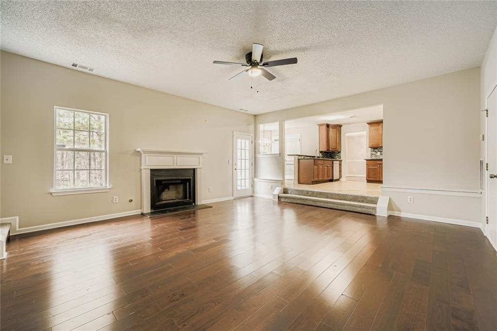 Inside, the home opens to bright, open living areas with a cozy fireplace anchoring the family room — a great spot for relaxing or entertaining.