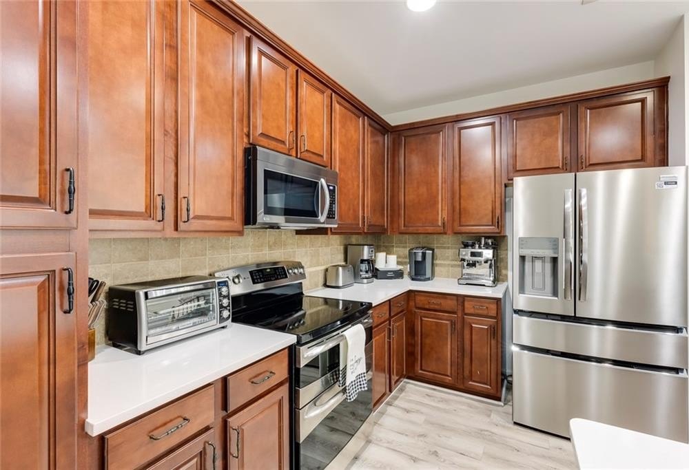 Step inside the bright and open main level where abundant natural light fills the generous living and dining spaces. Enjoy stylish updated light fixtures, new laminate flooring, and a sleek electric fireplace that adds both warmth and contemporary charm. The beautifully refreshed kitchen features updated white quartz countertops, a new refrigerator and dishwasher, and plenty of cabinet space—ideal for both everyday cooking and entertaining.