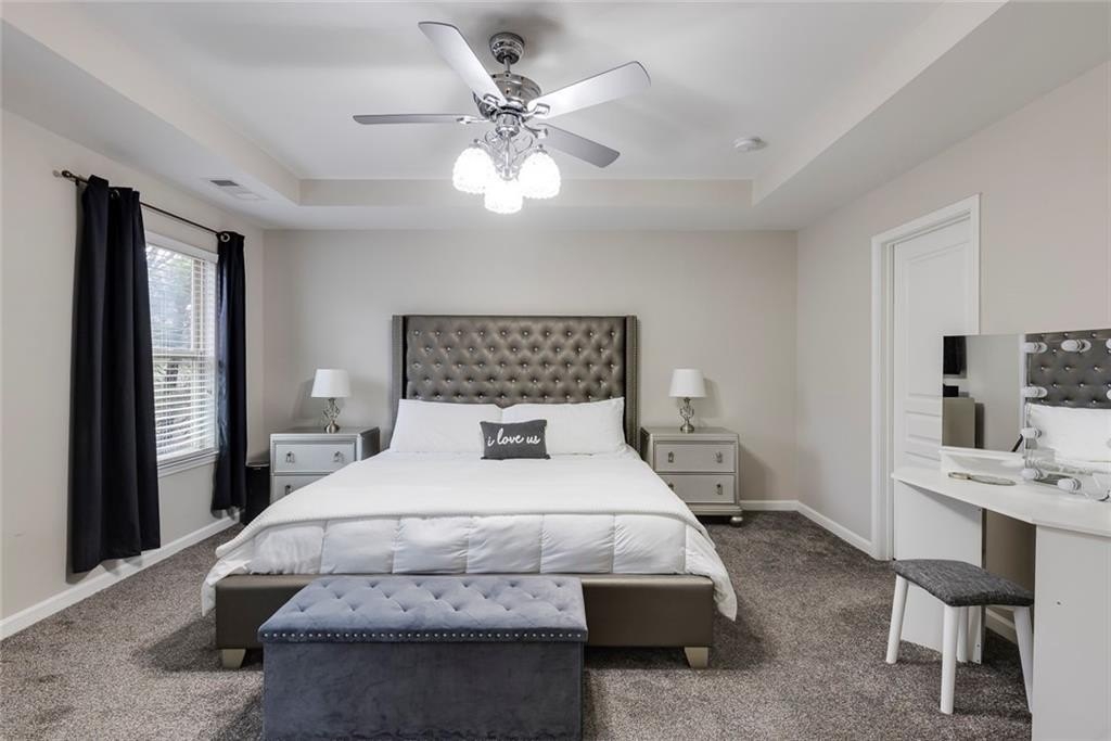 Upstairs, the expansive primary suite is a true retreat, complete with elegant tray ceilings, an exceptionally large walk-in closet, and a spa-like bath offering a separate soaking tub and shower. The upper level also includes two additional bedrooms, perfect for guests, family, or flexible use such as a home office. A cozy landing area at the top of the stairs creates the perfect nook for reading, relaxing, or unwinding before bed. You’ll also find a large laundry room equipped with cabinetry and shelving for effortless organization.