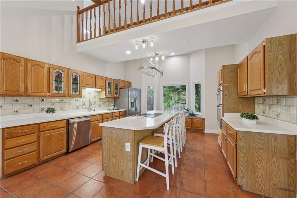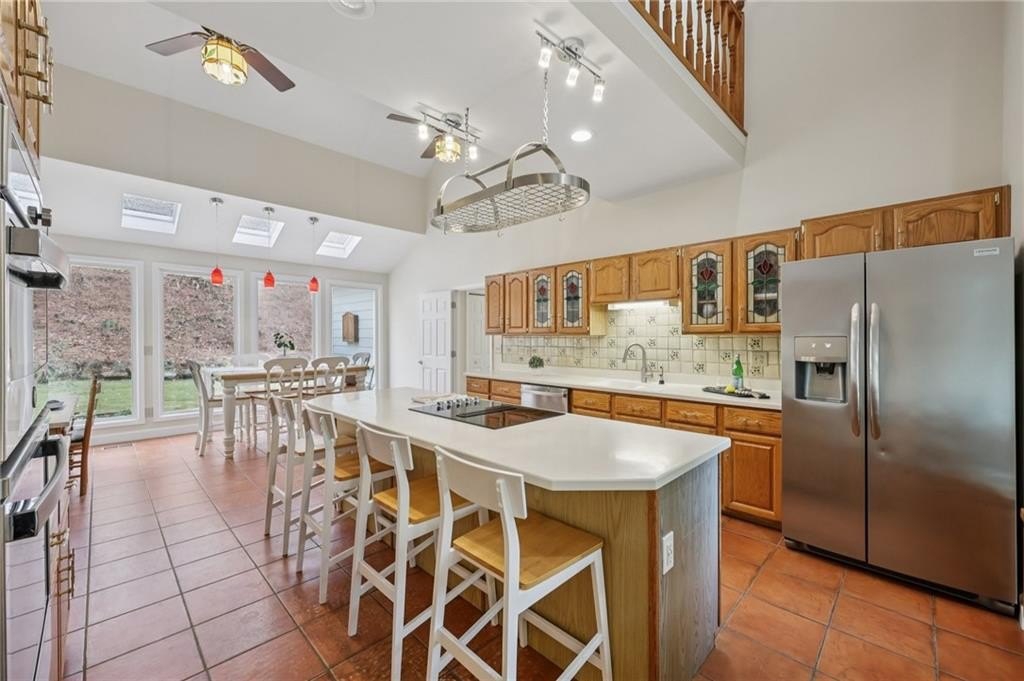The kitchen features a large island, abundant cabinetry, a separate breakfast area, and a bay window positioned at the front of the home with gorgeous views. A built-in office area with cabinets, drawers, and seating provides a functional workspace. From the kitchen, a door leads to the back patio where there is plenty of room for evening dinners, grilling, and entertaining. A designated seating area is ideal for a firepit.