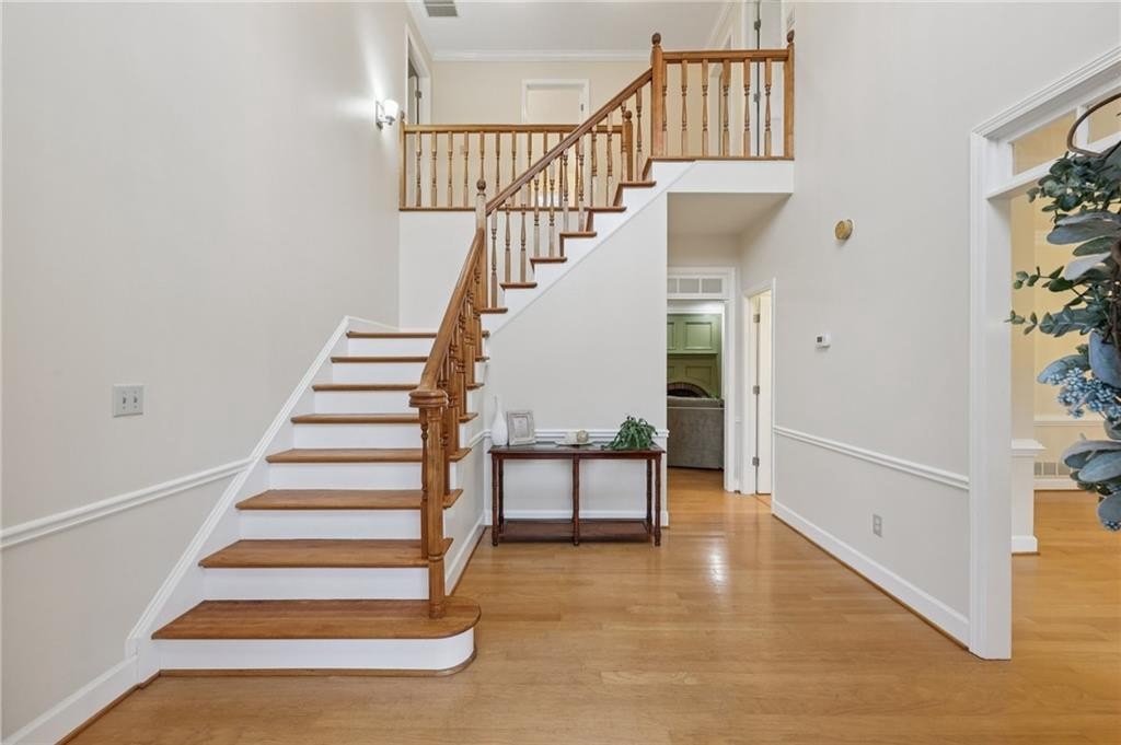 Inside, a two-story foyer opens to a bright main level with hardwood flooring, generous living areas, and a fireplace. The main level living room features two sets of doors that open to the outdoors, beautifully blurring the line between inside and outside. These doors make entertaining effortless, allowing guests to flow from the living room to the patio for dinners. It is easy to imagine summer gatherings with friends, doors open, music playing, and a soft breeze moving through the house.