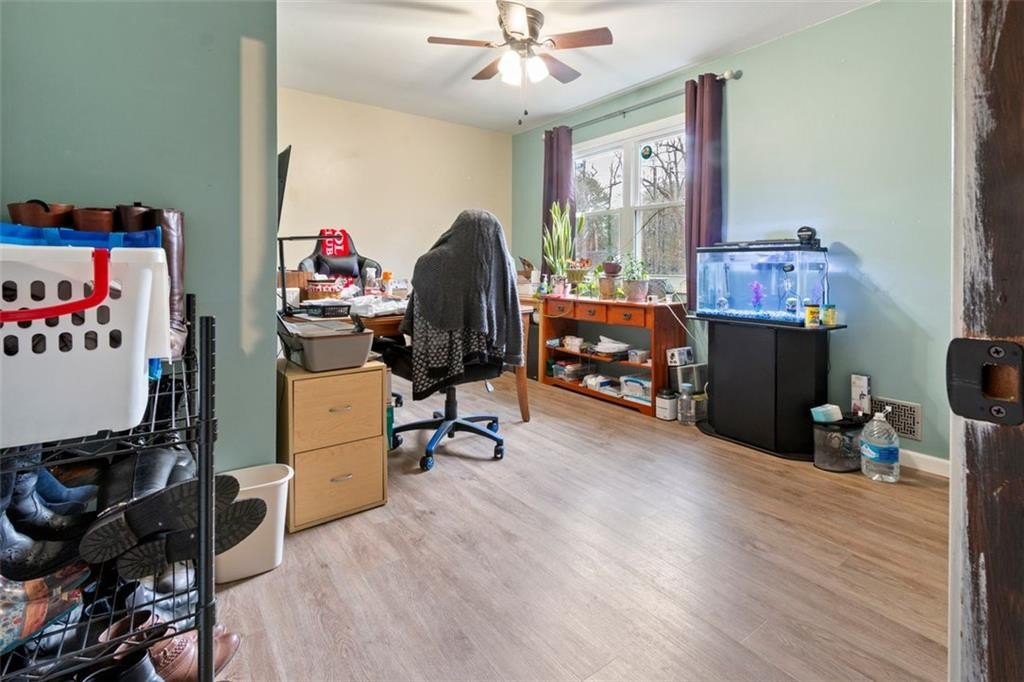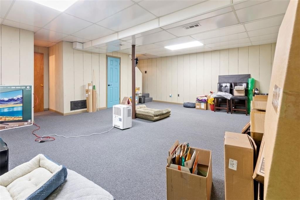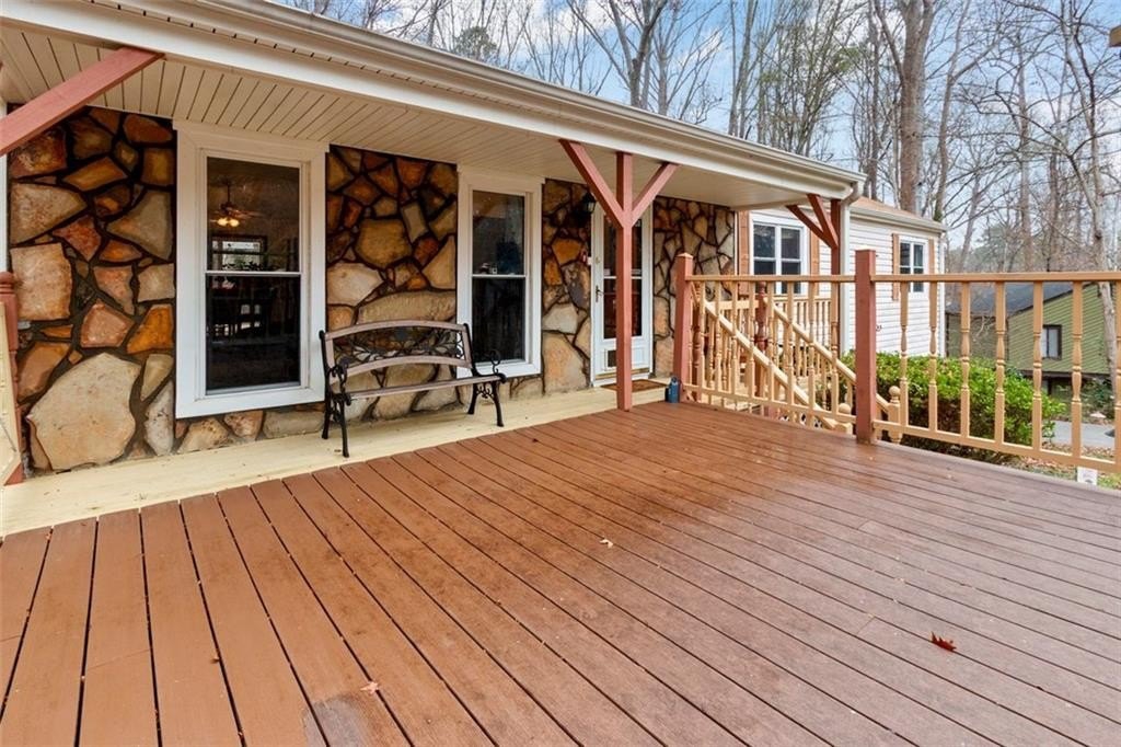 Welcome to this warm and inviting ranch-style home with a fantastic front porch and beautifully wooded surroundings. Inside, you'll find a bright, open living area with vaulted ceilings, a cozy fireplace, and large windows that bring in natural light and views of the trees. The layout flows easily into the dining area and the updated kitchen, which features granite countertops, abundant cabinet space, stainless steel appliances, and a stylish tile backsplash. The main level offers three comfortable bedrooms and two full baths, including a spacious primary suite. Downstairs, a large finished recreation room provides flexible space for hobbies, entertainment, a home office, or fitness. A half bath and access to the oversized garage add convenience and functionality. Step outside to enjoy multiple outdoor living spaces: a covered front porch, a wide back deck overlooking the yard, and room for gardening, pets, or play. The lot offers a peaceful, wooded setting while still being close to everyday amenities. Additional features include updated flooring, neutral interior paint, generous storage options, and a well-planned floor layout.