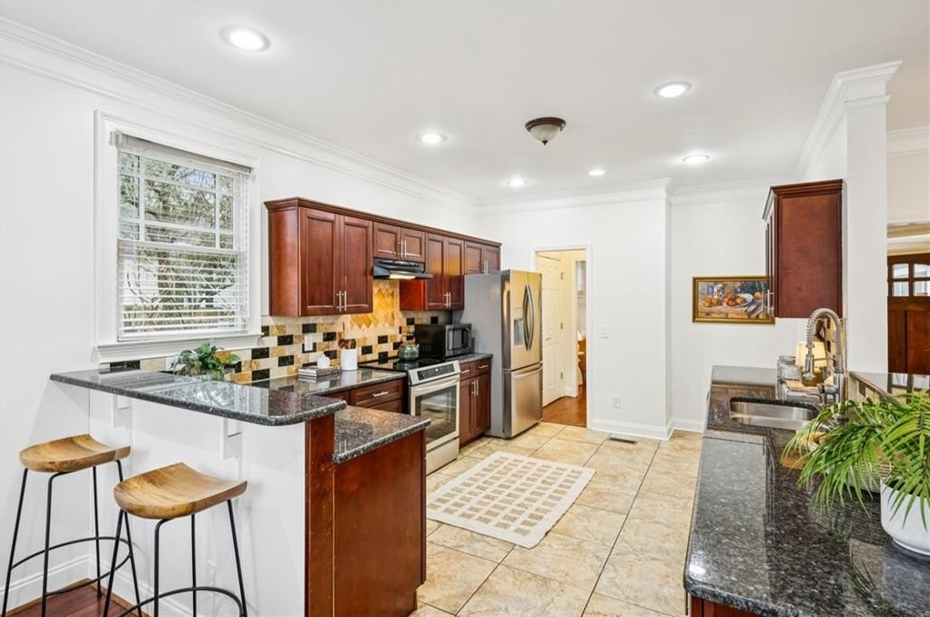 The heart of the home is the open-concept main level, where a spacious kitchen overlooks the dining and family room. Cooks will love the abundance of counter space and storage, from plentiful cabinetry to a double pantry, along with newer stainless-steel appliances.