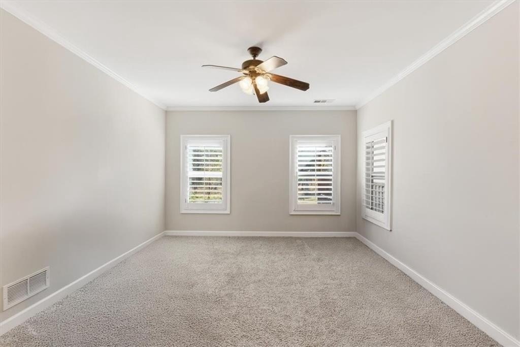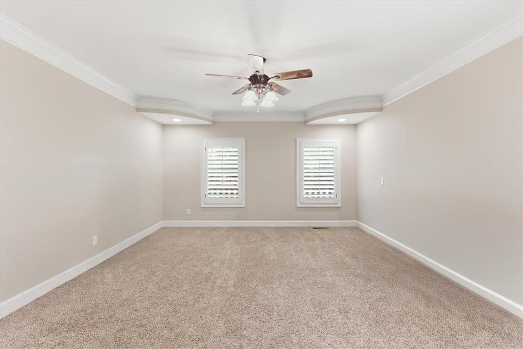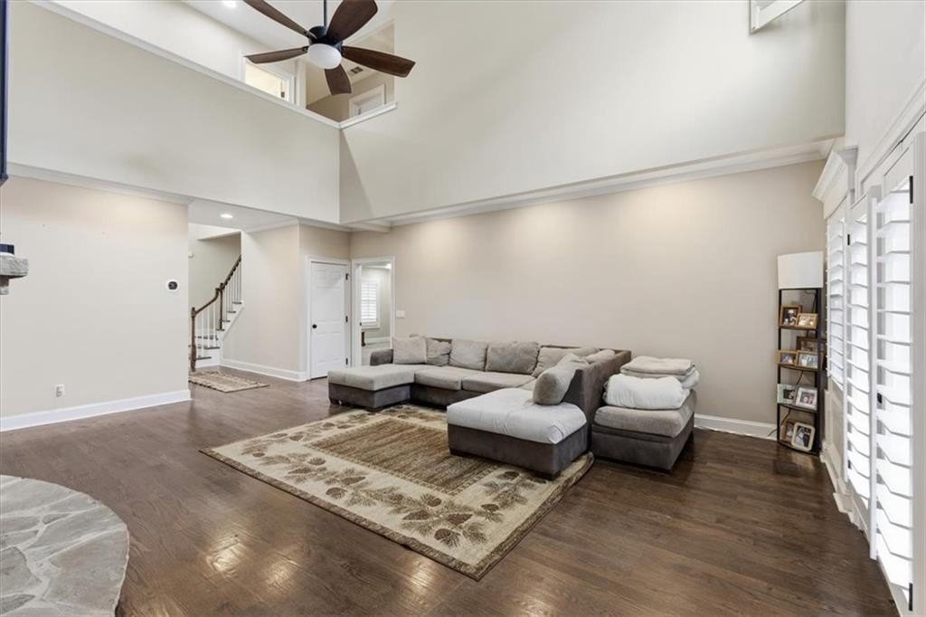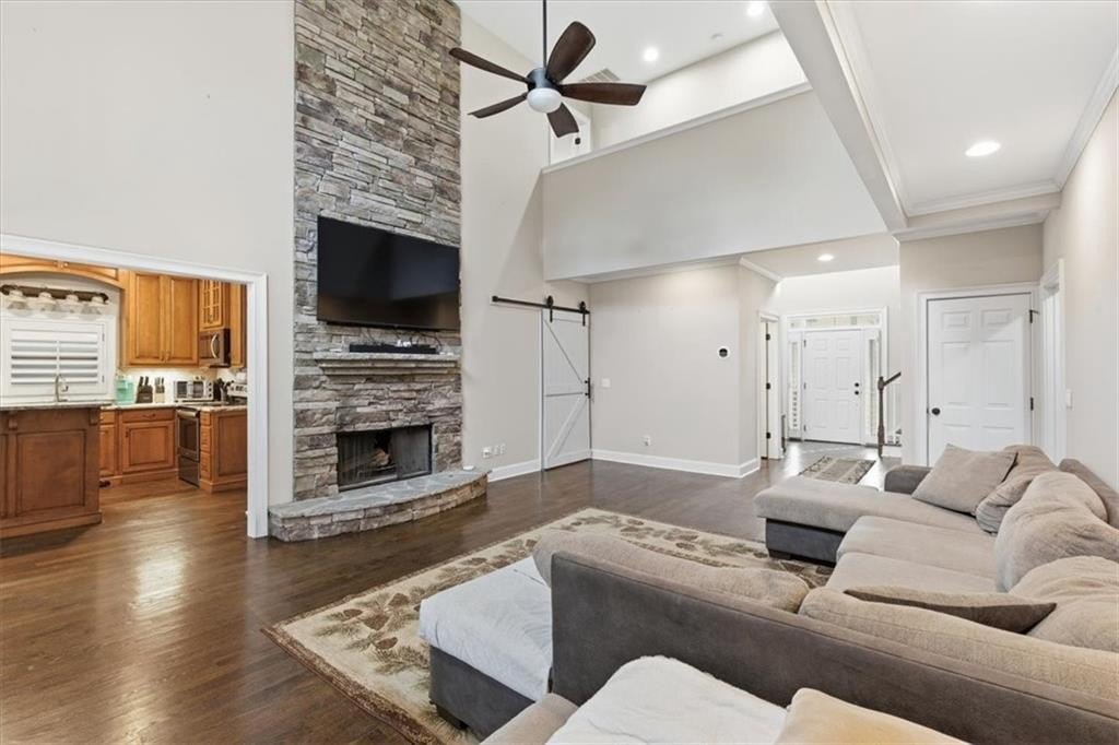 Inside, the vaulted family room impresses with soaring ceilings, hardwood floors, and walls of windows that flood the space with natural light. The adjacent formal dining room sets the stage for memorable gatherings.