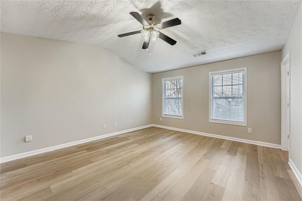 Inside, you'll find laminate wood floors throughout, a bright living room with a cozy fireplace, and an updated kitchen featuring granite counters, a breakfast bar, and a sunny dining area. Upstairs, a versatile loft offers extra space for a home office or media room, while the oversized primary suite includes a vaulted ceiling and a spa-like bath with dual vanities, soaking tub, and separate shower.