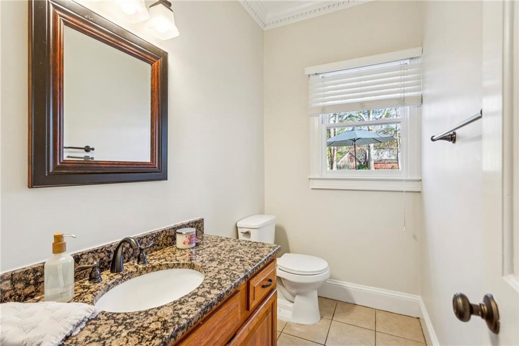 powder room for your guests just off the family room. The Eat-in kitchen is a great space for cooking and gathering with plenty of cabinetry, black granite counter space for prep, and a closet pantry for extra storage. The upper level hosts a large primary suite perfect for unwinding after a busy day. It has a