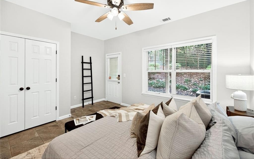 On the terrace level, you’ll find a guest bedroom with a full bath, ideal for visitors or easily transformed into a dedicated workspace or playroom, with direct access to a covered patio and green space.