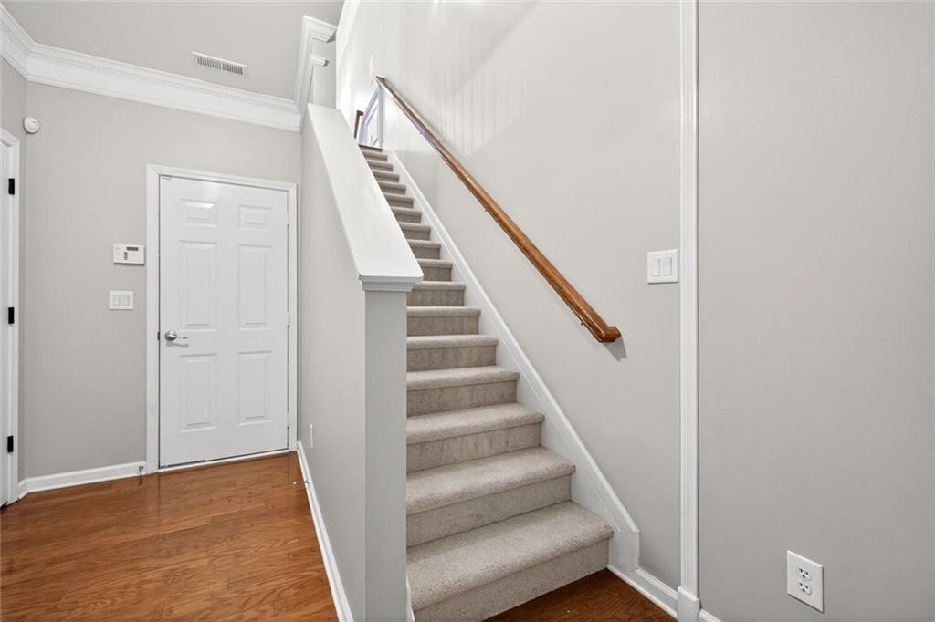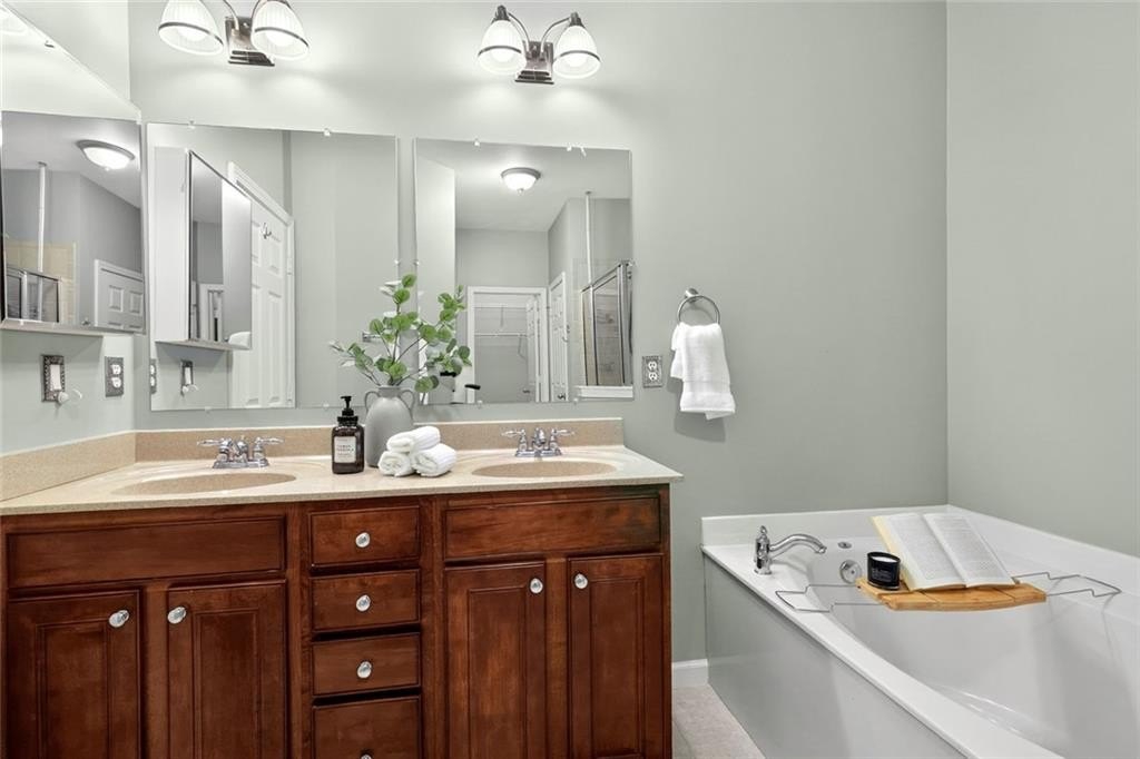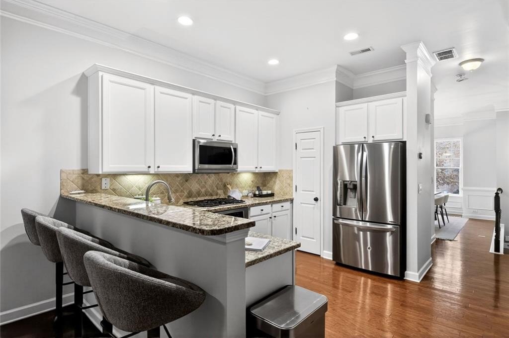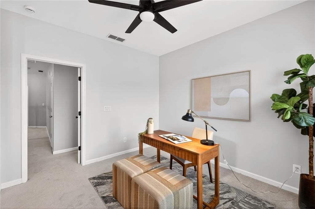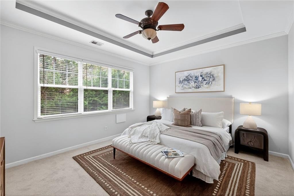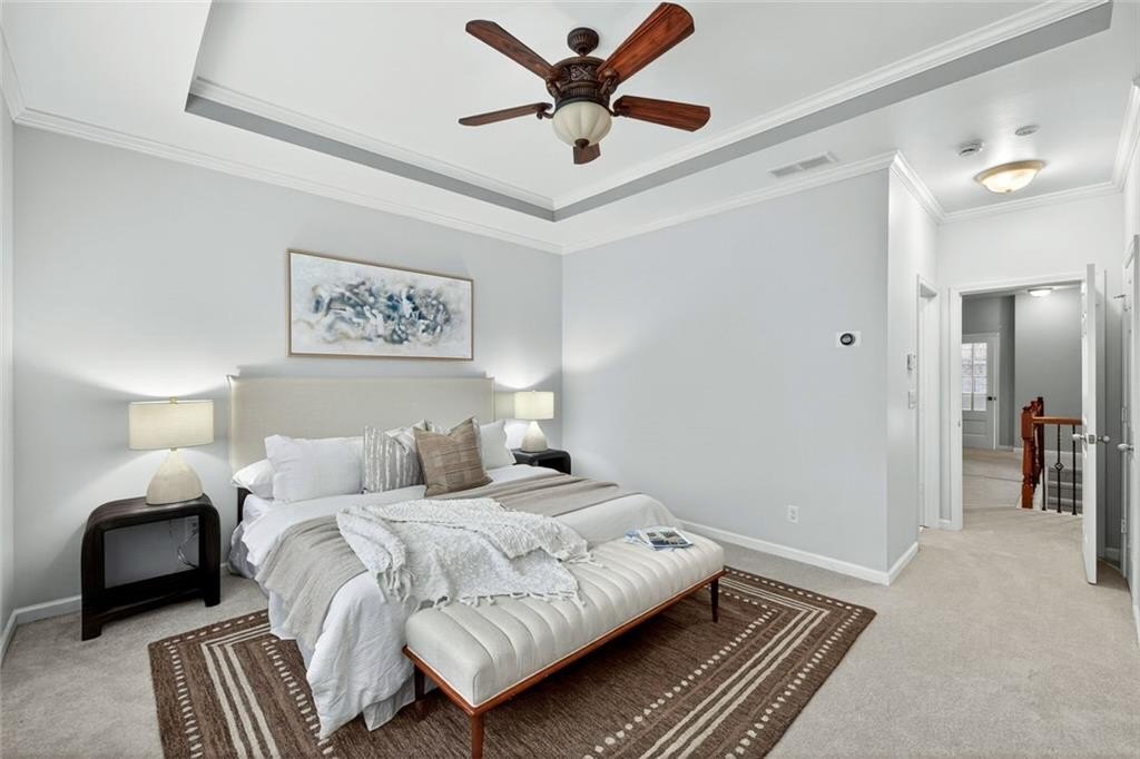 The spacious Owner’s suite on the third level is flooded with natural light and showcases a tray ceiling, a walk-in closet, and a spa-like bathroom complete with a soaking tub, double vanity, and tiled shower. A versatile secondary bedroom makes a perfect office, nursery, or home gym.