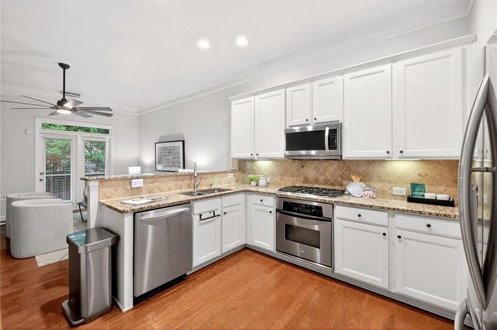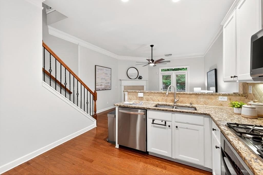 Step inside to a large, light-filled dining room—an inviting space ideal for hosting. The open kitchen flows into the living room and features abundant cabinetry, granite countertops, stainless steel appliances, a convenient breakfast bar and sizeable pantry. The bright living room includes a gas fireplace and opens to a private covered porch with serene views of lush green space.