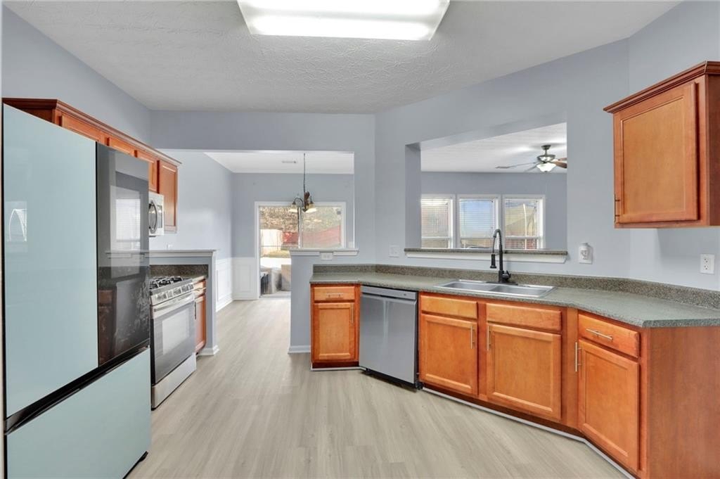 Welcome home to this beautiful 3BR/2.5BA residence in highly desirable Madison Landing! As you step inside, you’re greeted by tall ceilings and a welcoming foyer that flows naturally into the living room and kitchen. The entire home—inside and out—has been freshly painted and features brand-new flooring and new carpet, offering a clean and contemporary feel. The light-filled living area boasts gleaming laminate floors and a cozy fireplace. The spacious kitchen includes ample cabinetry, newer appliances, and a breakfast nook overlooking the backyard.