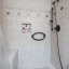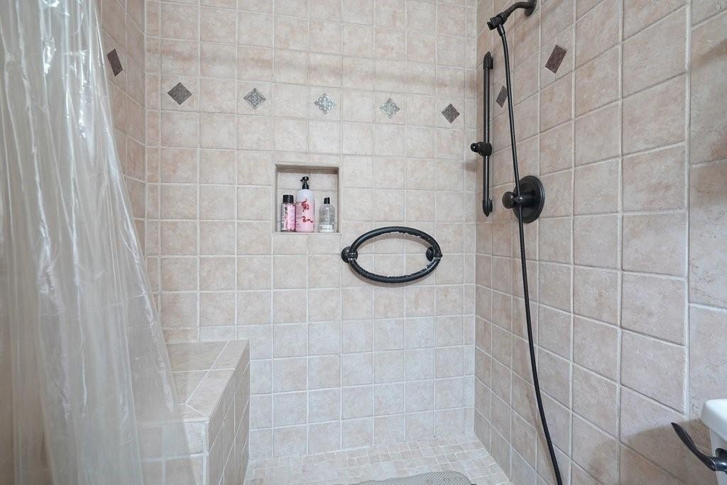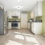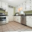 Tile kitchen flooring, white country cabinets & built-in window bench