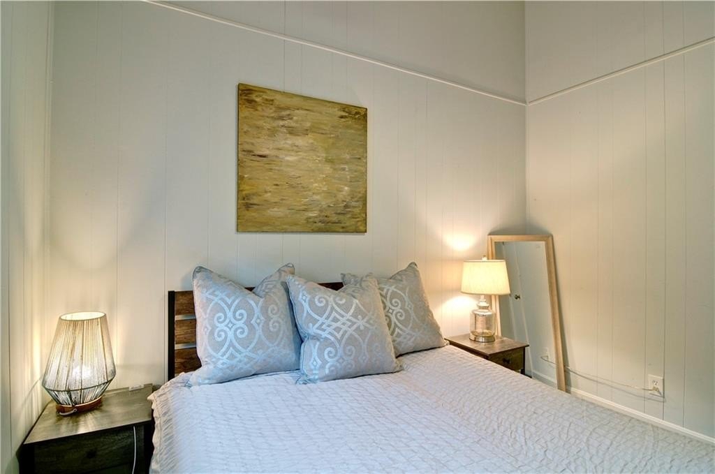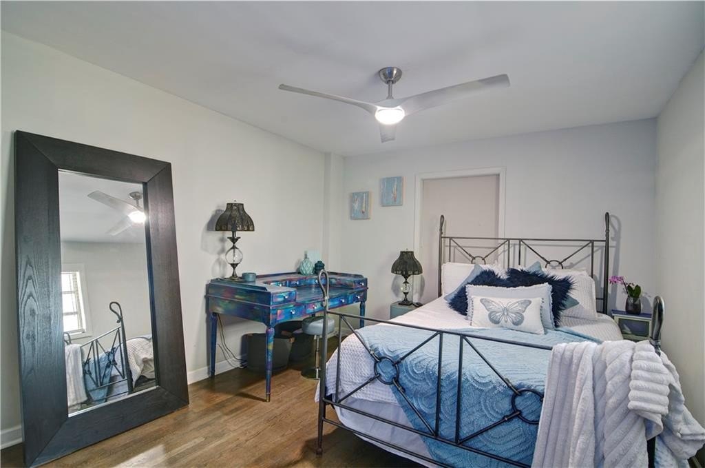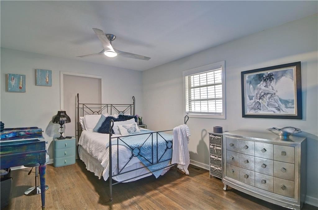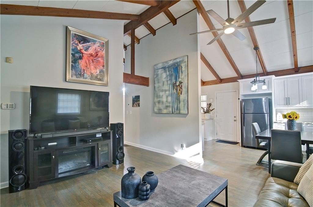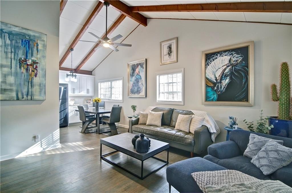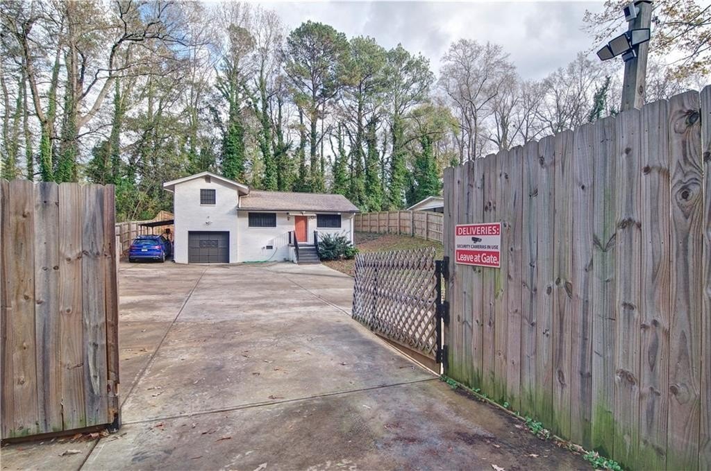 This renovated 2 bedroom, 2 bath home is a gem! The home has so many desirable features....Open concept with hardwood floors throughout including the bedrooms. Vaulted ceilings with beam details add architectural interest. NEW white kitchen cabinets, granite counter tops and tile back splash, NEW appliances, NEW light fixtures. A separate bank of cabinets in the dining area doubles as a server and the kitchen opens to a large back deck and private, level back yard. Front and rear yards are fully fenced and gated. Expansive, flat new concrete driveway and parking area provides ample parking plus space for a multitude of outdoor activities, hobbies or sports. Living room offers high beamed ceilings making the home feel open and airy. Primary bedroom is private and on it's own level with a beautiful new bathroom with shower and double vanities plus walk-in closet. Extra storage cabinet built-in above the stairs is perfect for luggage storage. The secondary bedroom is on the main level with main full bathroom across the hall. Home has NEW HVAC, New Upgraded Panel. This home has loads of custom details. Convenient location to I-75 access, shopping and restaurants. Minutes from Marietta Square. Come take a look and make it your own!