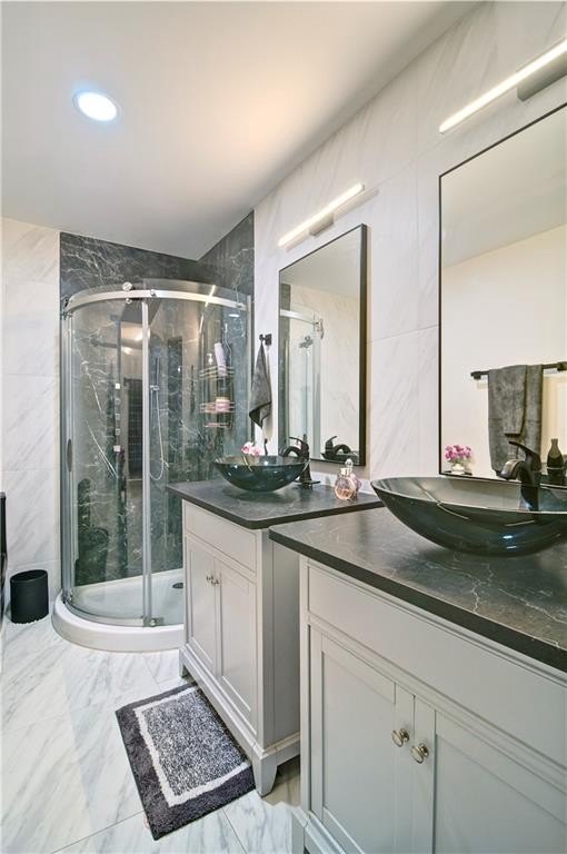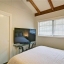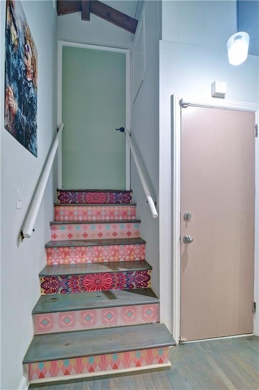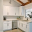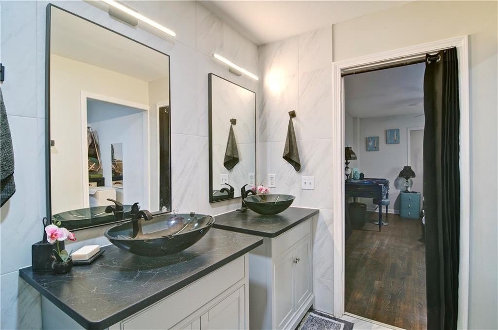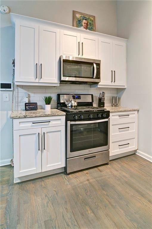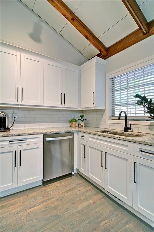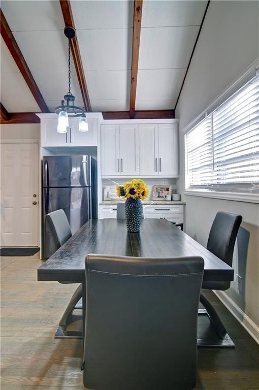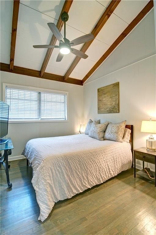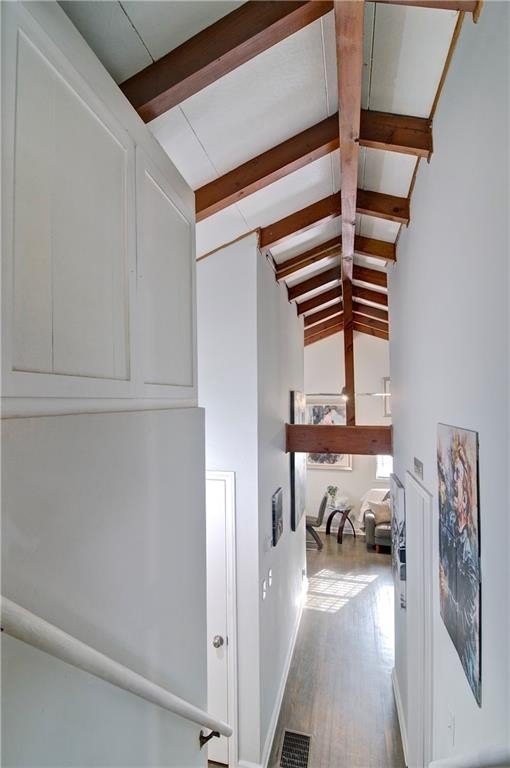 This renovated 2 bedroom, 2 bath home is a gem! The home has so many desirable features....Open concept with hardwood floors throughout including the bedrooms. Vaulted ceilings with beam details add architectural interest. NEW white kitchen cabinets, granite counter tops and tile back splash, NEW appliances, NEW light fixtures. A separate bank of cabinets in the dining area doubles as a server and the kitchen opens to a large back deck and private, level back yard. Front and rear yards are fully fenced and gated. Expansive, flat new concrete driveway and parking area provides ample parking plus space for a multitude of outdoor activities, hobbies or sports. Living room offers high beamed ceilings making the home feel open and airy. Primary bedroom is private and on it's own level with a beautiful new bathroom with shower and double vanities plus walk-in closet. Extra storage cabinet built-in above the stairs is perfect for luggage storage. The secondary bedroom is on the main level with main full bathroom across the hall. Home has NEW HVAC, New Upgraded Panel. This home has loads of custom details. Convenient location to I-75 access, shopping and restaurants. Minutes from Marietta Square. Come take a look and make it your own!