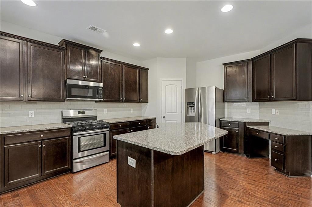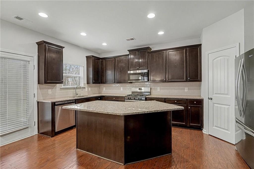 Featuring a gleaming granite island, stainless steel appliances, chic recessed lighting, and