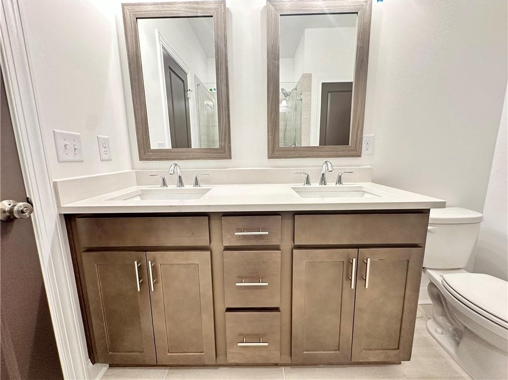 Third Level: Relax in the spacious Primary Suite featuring a walk-in closet and a spa-inspired bath with dual quartz vanities and a walk-in shower with tile surround. A secondary bedroom with its own private bath offers comfort and flexibility for guests or home office needs.
