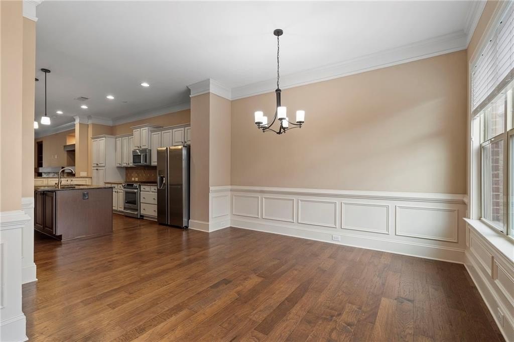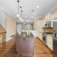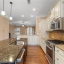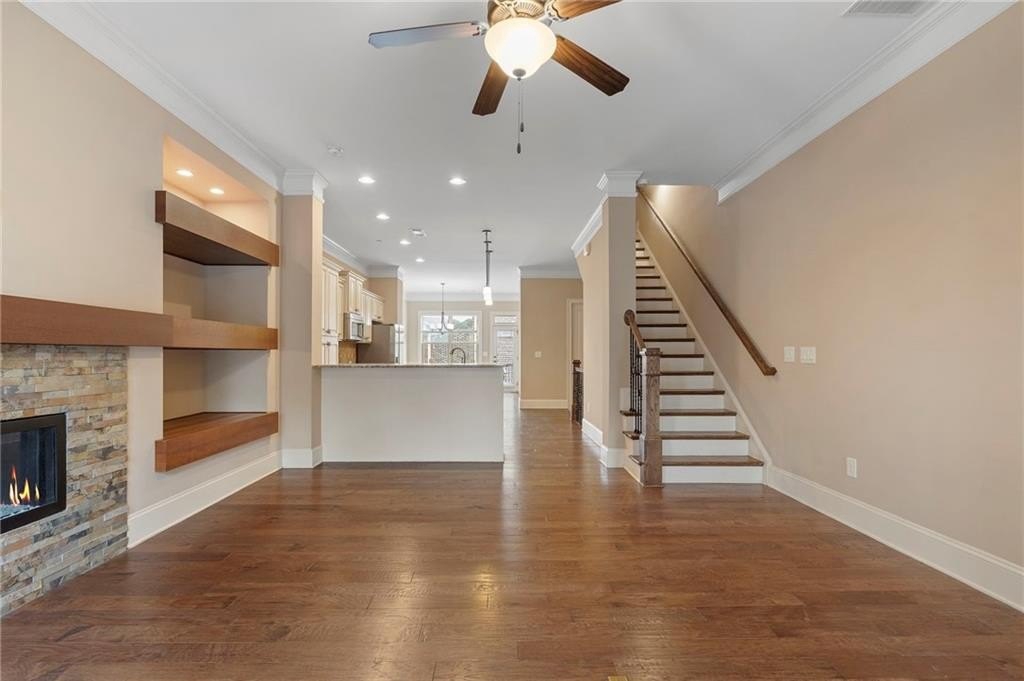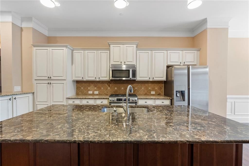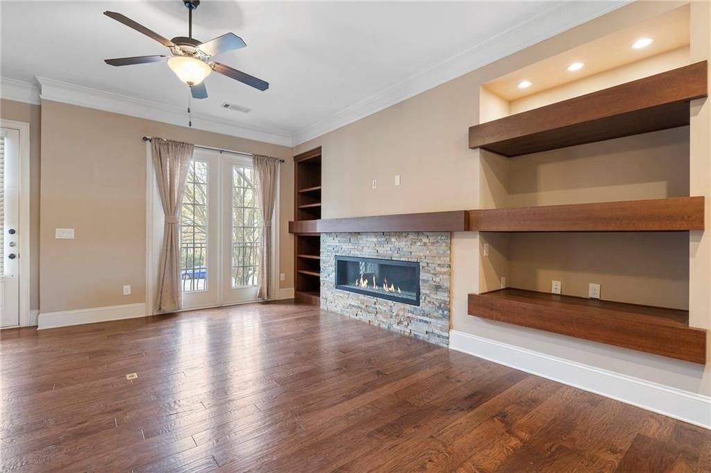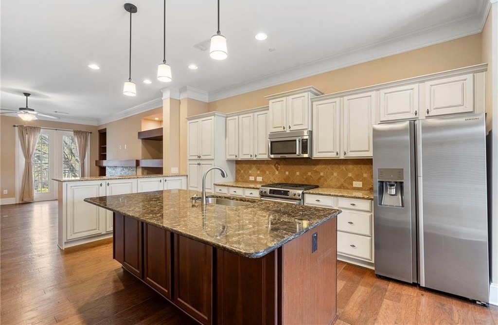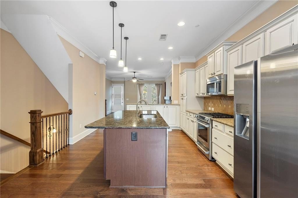 The family room features a modern linear fireplace with stone surround and built-in bookshelves. The upgraded chef’s kitchen offers abundant cabinetry, exotic granite countertops, and stainless-steel appliances. An oversized island and peninsula together provide comfortable seating for up to eight, perfect for everyday dining and entertaining. The main level boasts 10' ceilings and hardwood floors throughout.