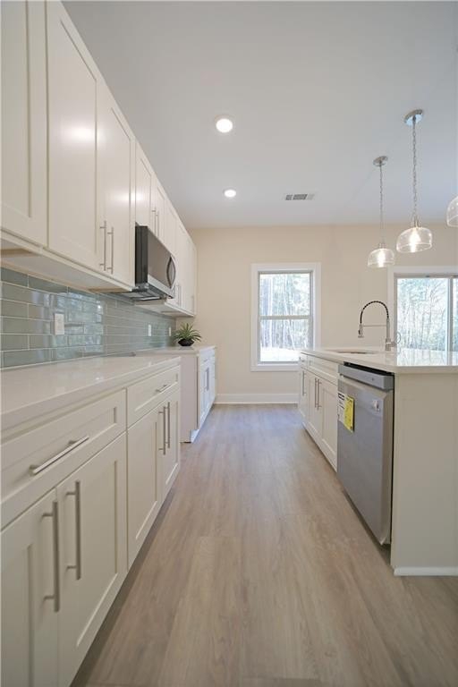 This thoughtfully crafted home is packed with designer upgrades, modern finishes, and an open-concept layout perfect for today’s lifestyles. Step into a bright and modern floorplan featuring a spacious living area, abundant natural light, and a beautifully designed kitchen that flows seamlessly into your dining and entertaining spaces. Primary Suite Retreat. Master with double vanities, spacious walk-in closet. Designer Interior Upgrades, Luxury vinyl plank flooring throughout (NO carpet) Quartz countertops + shaker cabinets, Subway tile backsplash, Pendant lighting & modern fixtures, Stainless LG appliance package included, Ceiling fans in every room.