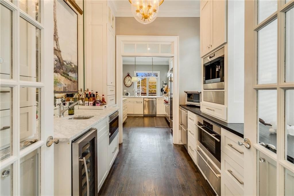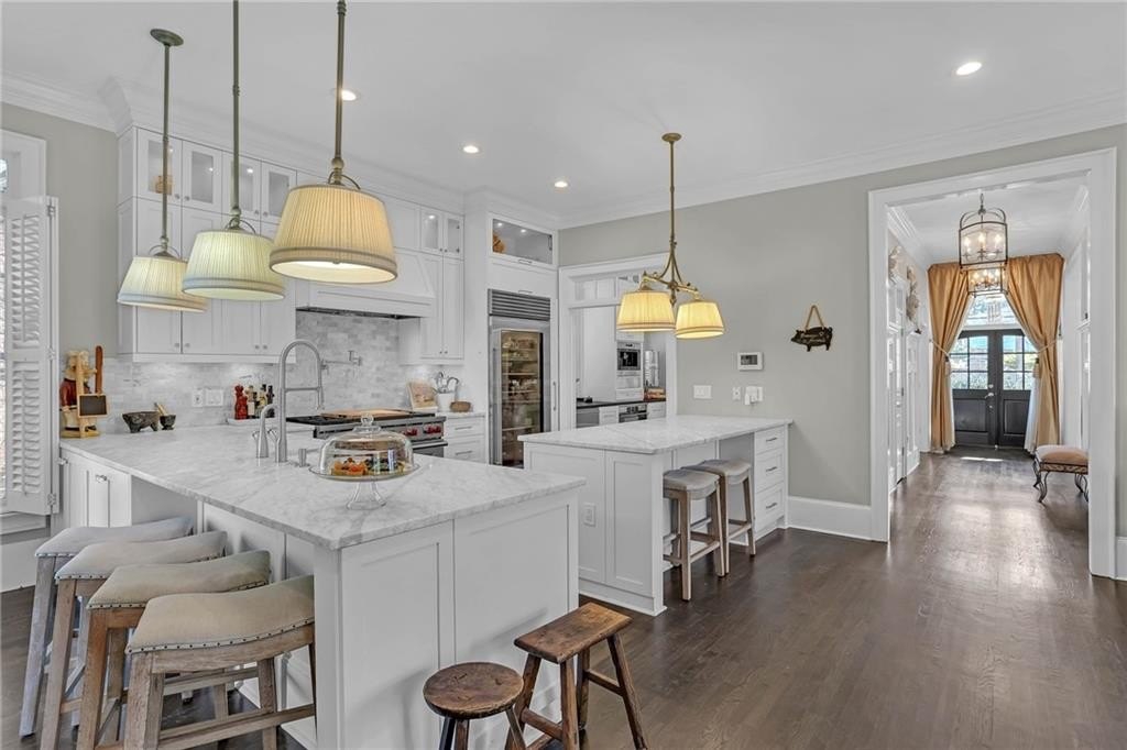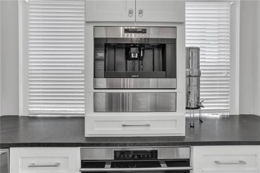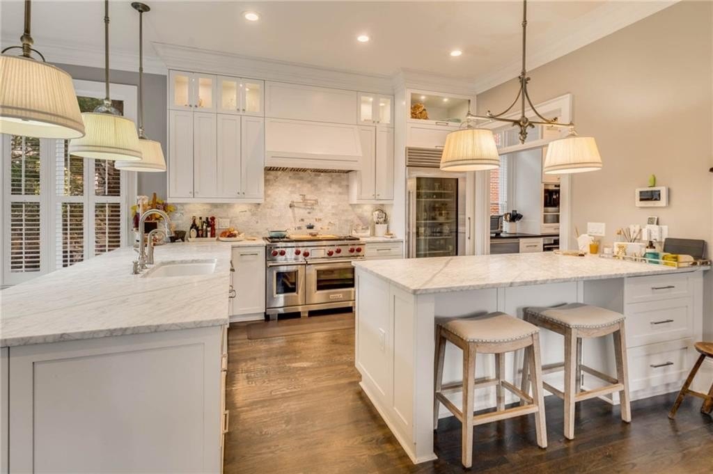 The extraordinary chef’s kitchen boasts a 48” Wolf range, Sub-Zero appliances, dual islands, and custom cabinetry. A fully outfitted butler’s pantry provides additional high-end appliances, a Wolf coffee system, generous storage, and ample prep space. An eat-in area opens to the kitchen deck, perfect for casual dining and outdoor relaxation.