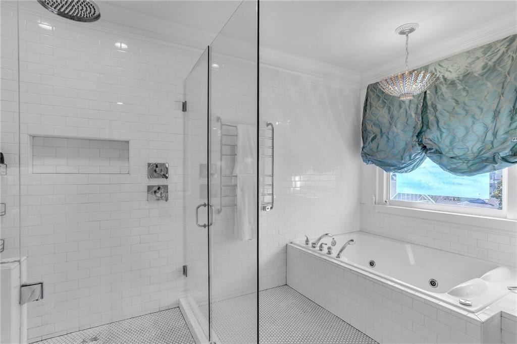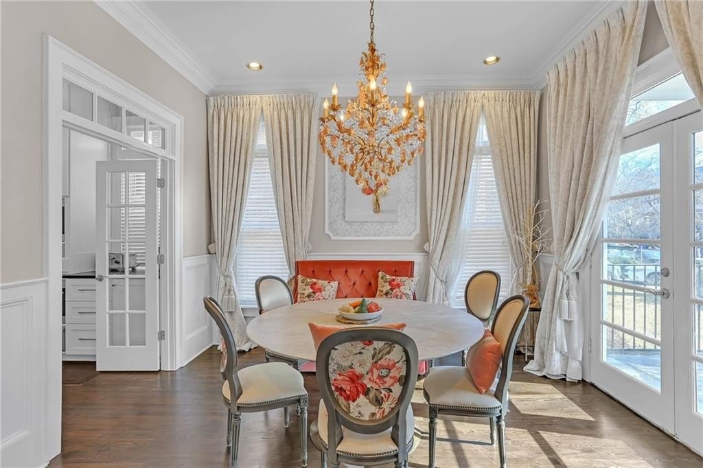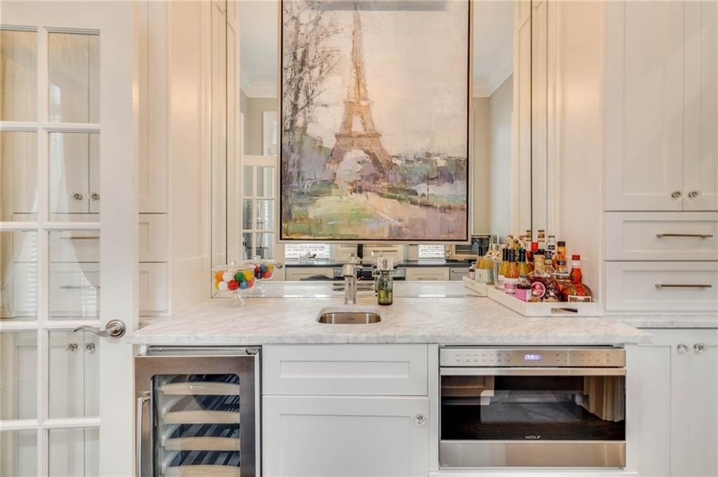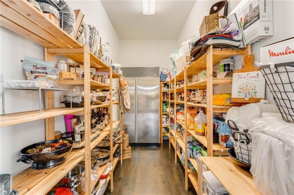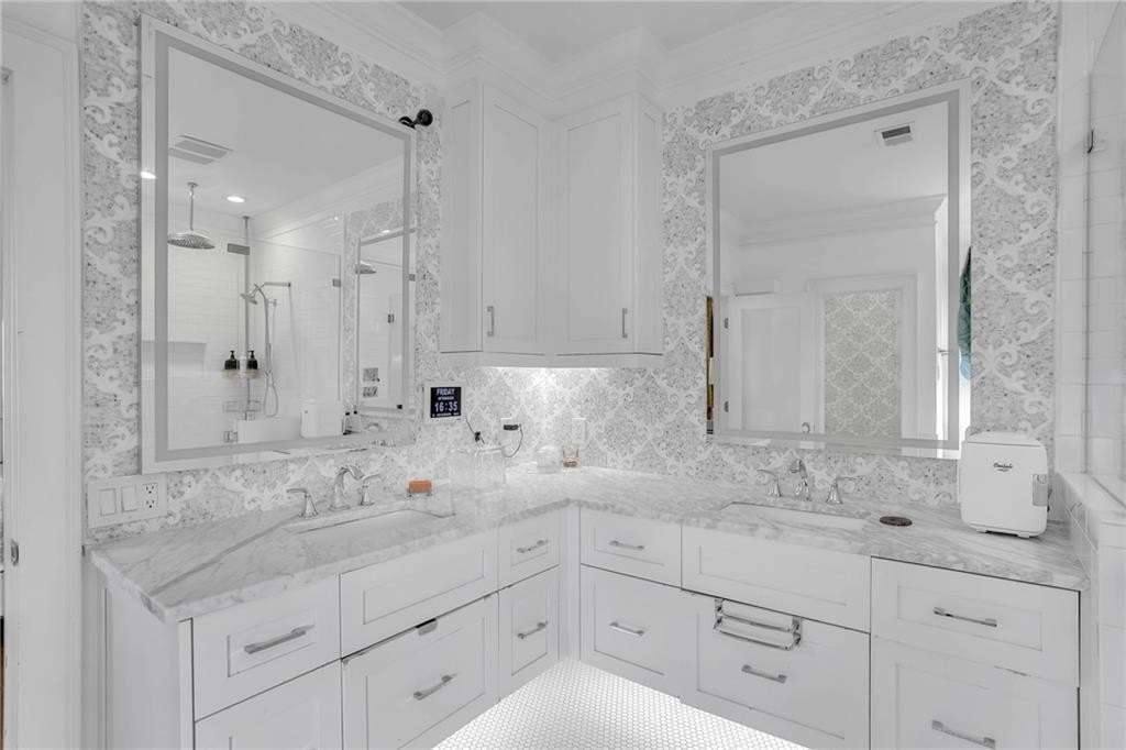The extraordinary chef’s kitchen boasts a 48” Wolf range, Sub-Zero appliances, dual islands, and custom cabinetry. A fully outfitted butler’s pantry provides additional high-end appliances, a Wolf coffee system, generous storage, and ample prep space. An eat-in area opens to the kitchen deck, perfect for casual dining and outdoor relaxation.