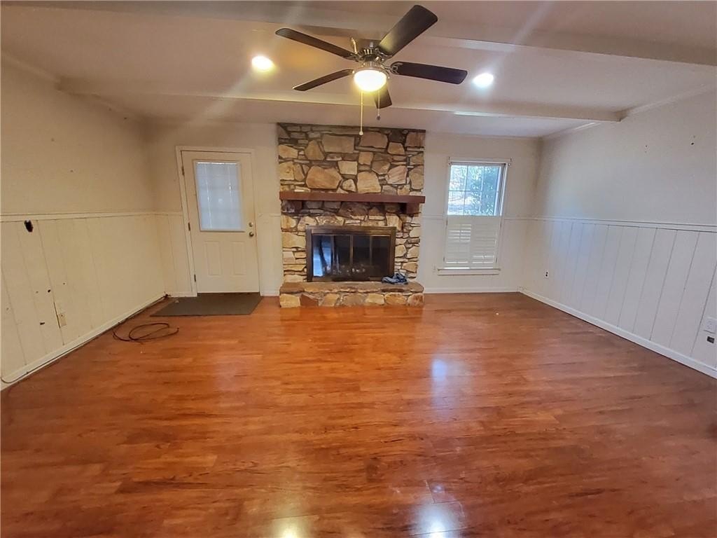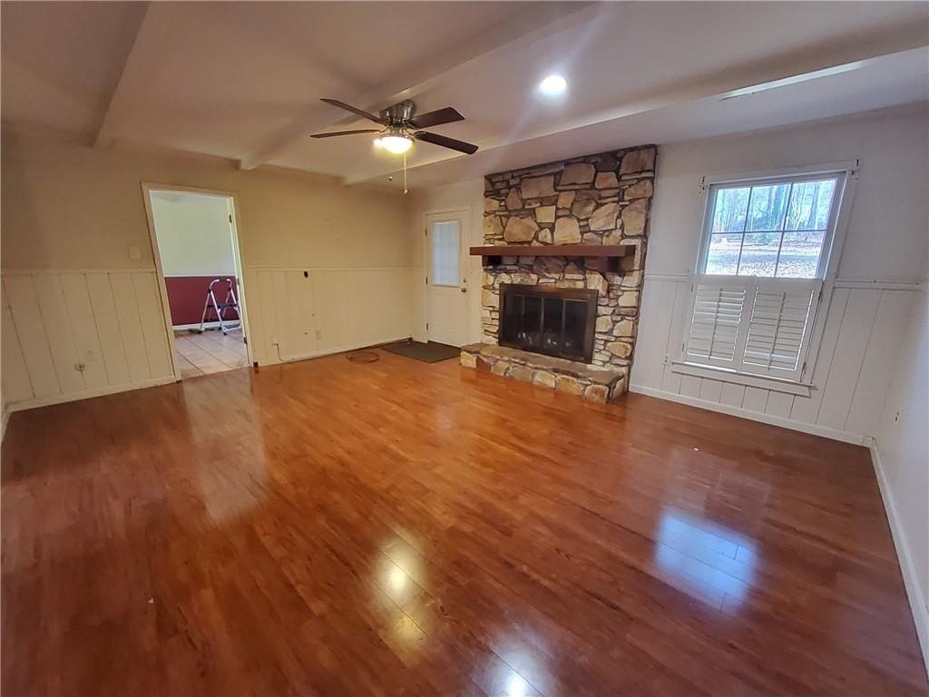 The warm and inviting family room features a stunning stone gas fireplace, creating a cozy, cabin-like ambiance that’s perfect for relaxing or entertaining. The layout feels open and functional, offering great flow throughout the home.