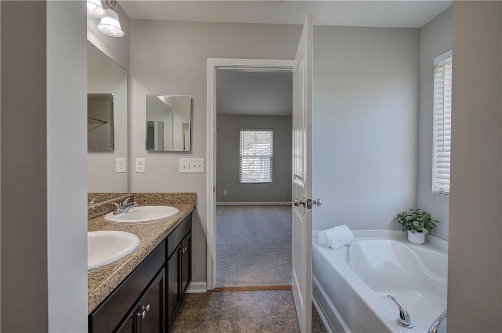 All five bedrooms are located upstairs and feature brand-new carpet, while vaulted ceilings in every bedroom enhance the home’s open, airy feel. The oversized primary suite offers a private retreat with a spa-inspired bath featuring a double vanity, soaking tub, and separate shower.