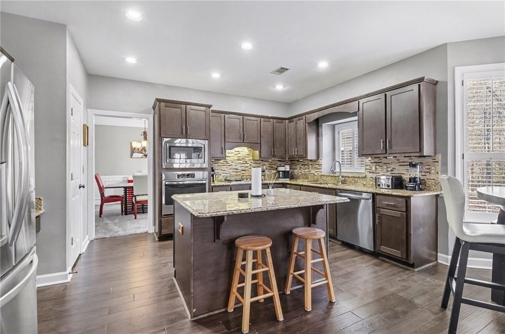 The kitchen features granite countertops, soft-close cabinetry, a stylish backsplash, and hardwood floors added within the last few years. The separate dining room with classic wainscoting comfortably seats 12. The family room offers an open-concept feel and includes an updated stacked-stone fireplace.