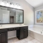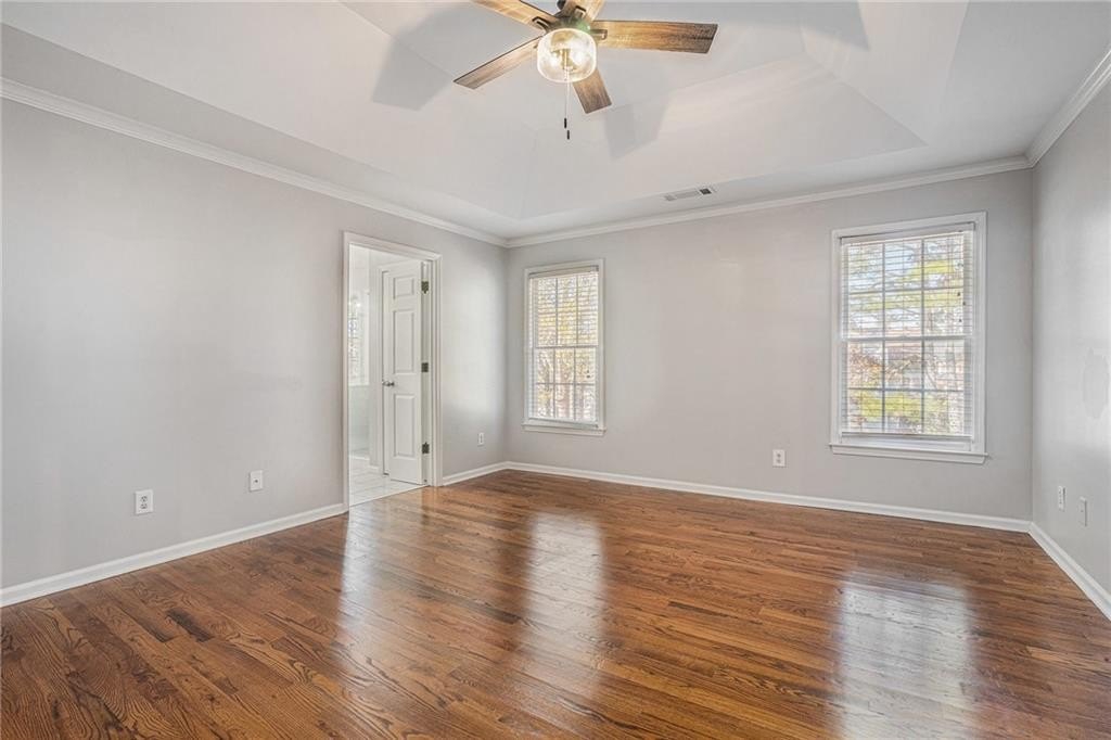 Upstairs, the main bedroom feels composed and balanced. Hardwood flooring, a beautiful tray ceiling, and generous proportions create ease without excess. The ensuite bath includes a soaking tub, a glass-enclosed shower, and a double vanity that supports daily routines with space to spare. Additional bedrooms maintain the same attention to detail and natural light, offering flexibility for family, work, or guests.