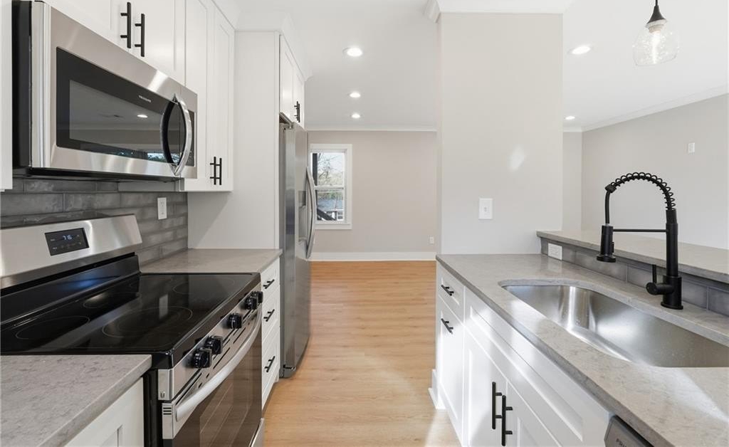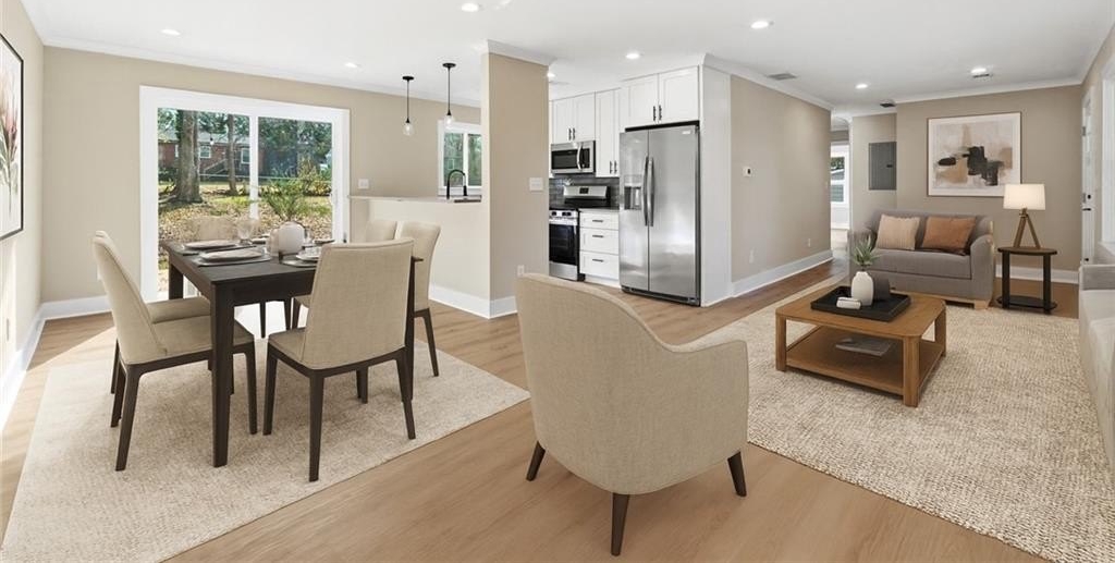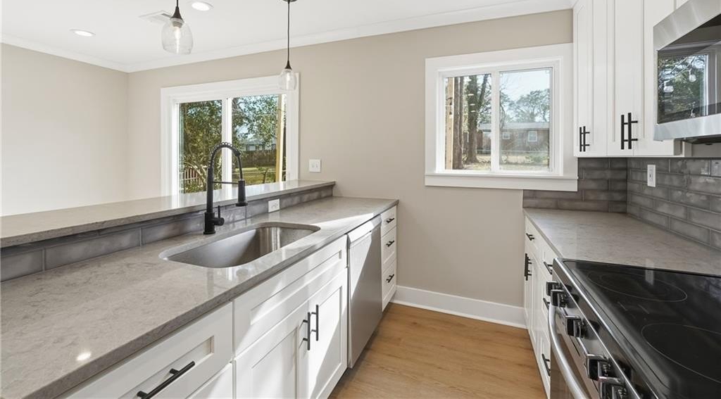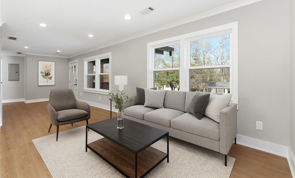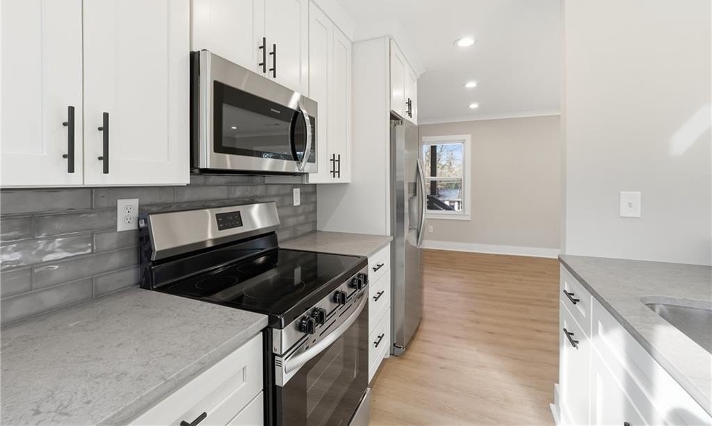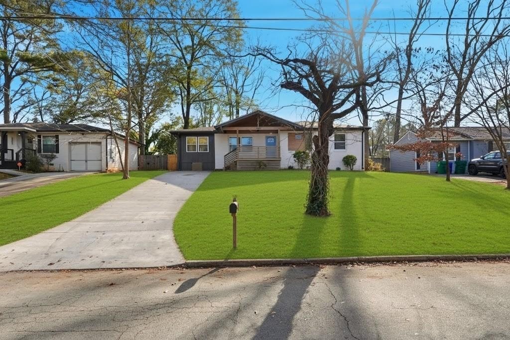 Renovated home is ideally located just minutes from East Lake Golf Club, Decatur Square, DeKalb Farmers Market, Emory Hospital, the YMCA, top-rated schools, stores, shops and restaurants. New driveway, new front and back decks, new electrical, plumbing, HVAC, water heater, windows, roof, flooring, doors, vanities, toilets, and remote-controlled ceiling fans and additional fencing that creates a fully enclosed, private backyard. Inside, the home offers luxury vinyl plank flooring throughout and an open, modern layout. The gourmet kitchen is equipped with quartz countertops, brand-new Frigidaire energy-efficient stainless steel appliances, and soft-close white shaker cabinetry. Primary suite includes a custom barn door leading to a luxurious en-suite bathroom with a walk-in shower and double vanity. Two additional bedrooms share a second full bathroom. This is truly a move-in-ready home, schedule your showing today!