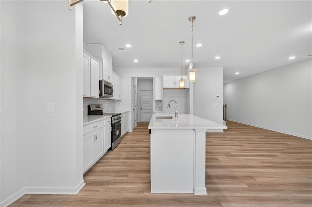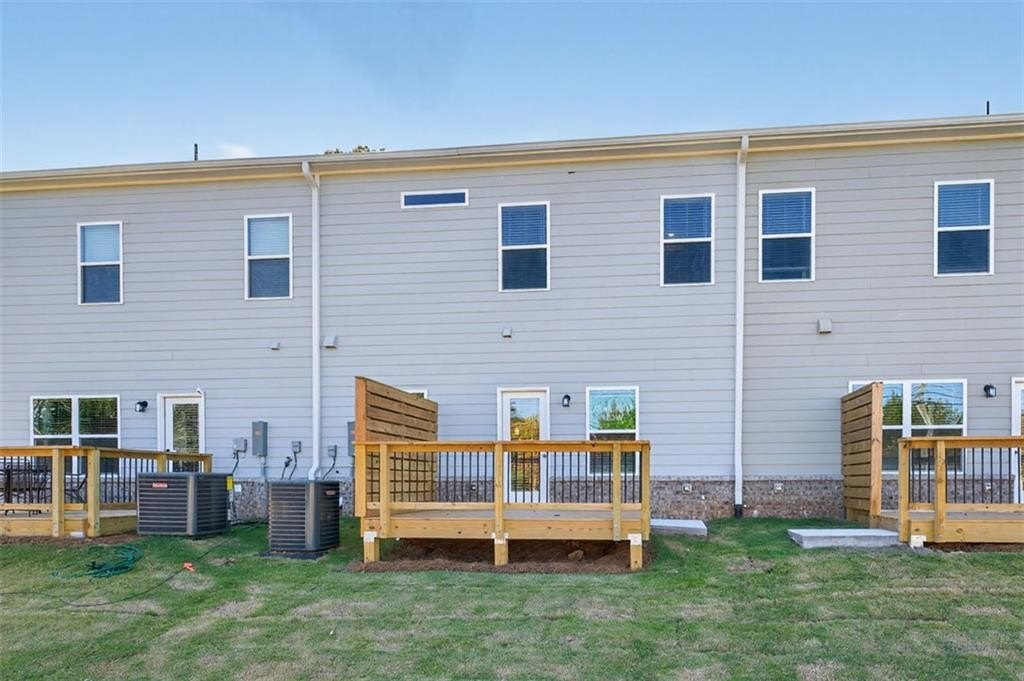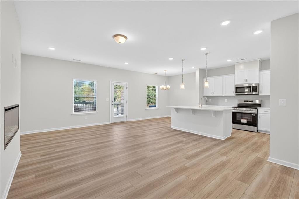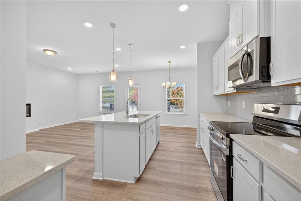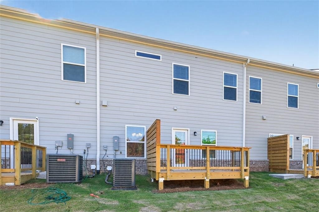 Move in Ready! The Norwood II floorplan in Smith Douglas Homes Franklin Manor community. Fantastic Location! This beautifully designed townhome features one of our most popular floorplans and is filled with natural light from every angle. With designer upgrades throughout, and blinds already included, this home is truly move-in ready. The kitchen stands out with upgraded cabinetry, quartz countertops, and a center island accented by pendant lighting. It opens seamlessly into a bright, inviting family room highlighted with a sleek linear fireplace. Luxury vinyl plank flooring extends across the main level for a clean, modern look, and the private deck is the perfect spot to unwind or host weekend get-togethers. Upstairs, the spacious Primary suite offers a walk-in closet and a spa-inspired bath featuring a tiled shower and double vanity. Two additional bedrooms and a convenient laundry room round out the second floor—both levels offering 9-foot ceilings for an airy, open feel.