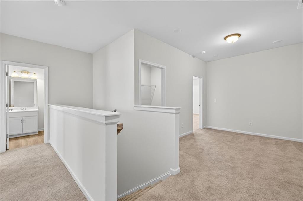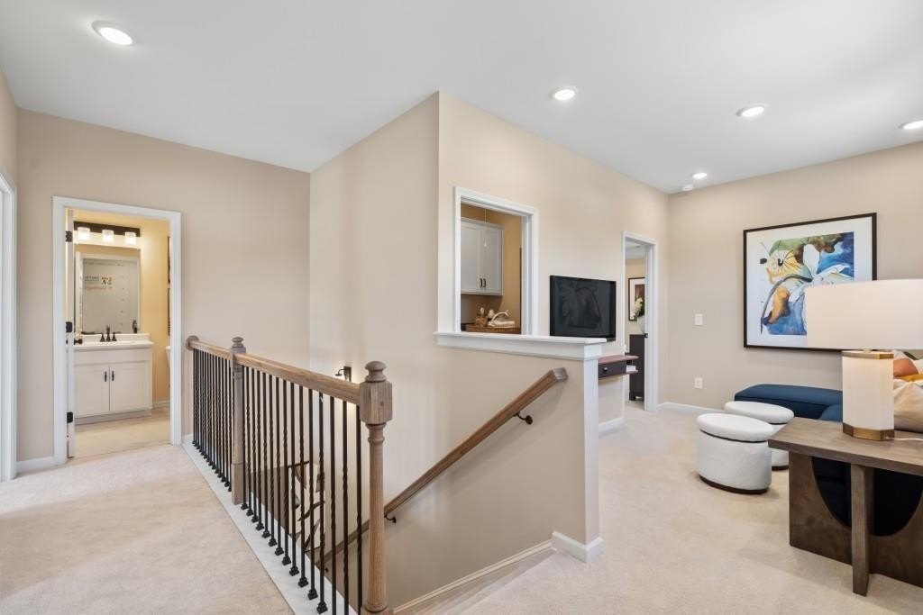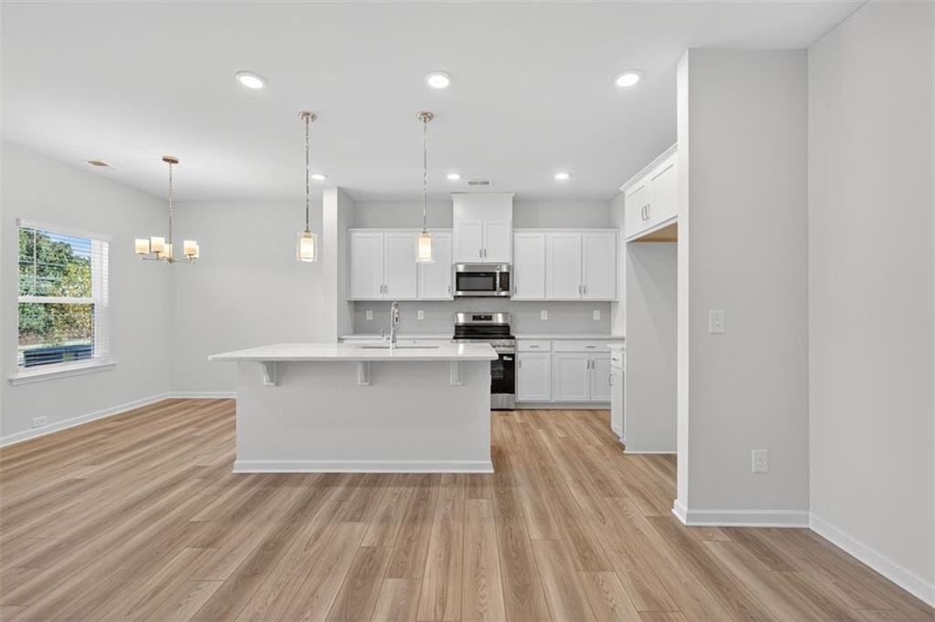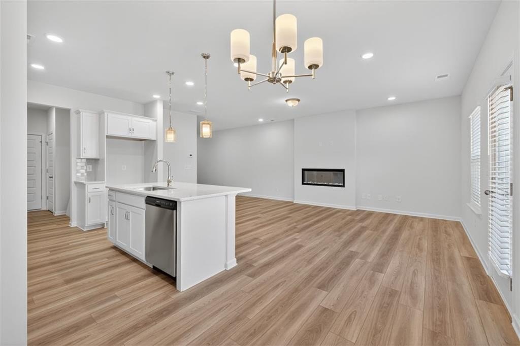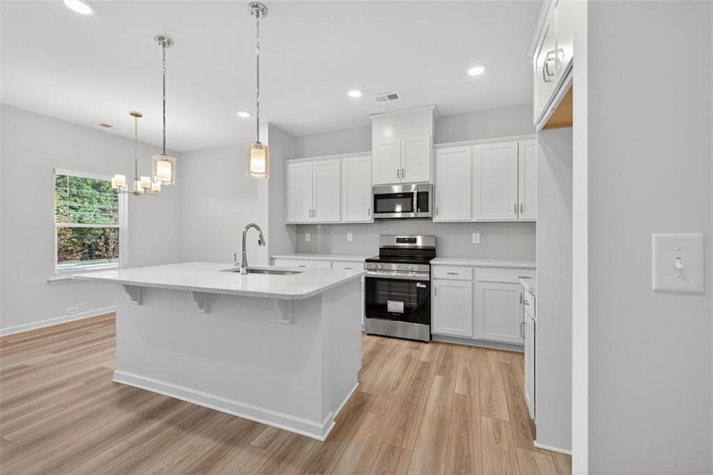 Move in Ready! The Norwood II floorplan in Smith Douglas Homes Franklin Manor community. Fantastic Location! This beautifully designed townhome features one of our most popular floorplans and is filled with natural light from every angle. With designer upgrades throughout, and blinds already included, this home is truly move-in ready. The kitchen stands out with upgraded cabinetry, quartz countertops, and a center island accented by pendant lighting. It opens seamlessly into a bright, inviting family room highlighted with a sleek linear fireplace. Luxury vinyl plank flooring extends across the main level for a clean, modern look, and the private deck is the perfect spot to unwind or host weekend get-togethers. Upstairs, the spacious Primary suite offers a walk-in closet and a spa-inspired bath featuring a tiled shower and double vanity. Two additional bedrooms and a convenient laundry room round out the second floor—both levels offering 9-foot ceilings for an airy, open feel.