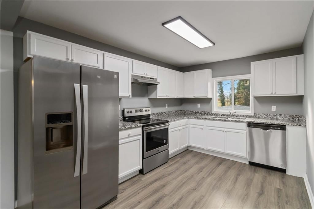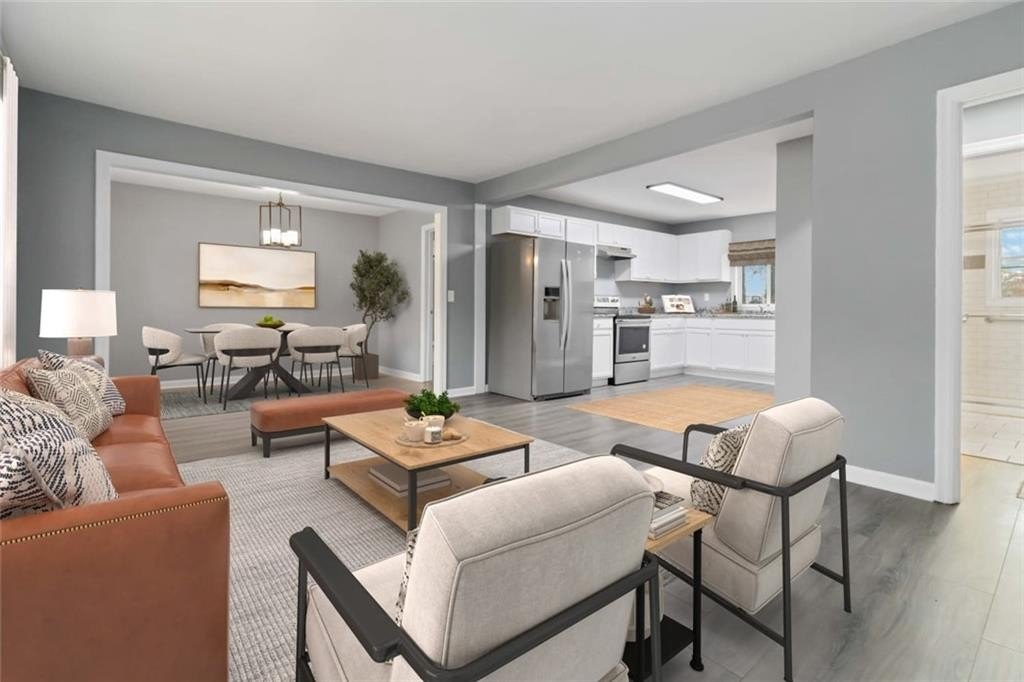 This updated Doraville home offers a fresh, clean look inside with new flooring, updated paint, modern light fixtures, and spacious rooms throughout. The open living and dining areas give you plenty of space to spread out, and the large windows bring in great natural light. The kitchen has been refreshed with white cabinets, granite countertops, stainless-steel appliances, and a practical layout that works well for everyday living. The bathrooms have been improved with new finishes, and the bedrooms are a good size with neutral colors that make the home easy to personalize. Outside, the lot offers a deep backyard with mature trees great for outdoor projects, pets, or simply having extra space. This home sits in a convenient Doraville location close to I-285, Buford Highway, grocery stores, restaurants, and public transportation. It's a solid option for anyone looking for an updated home in a growing and accessible area. Come see the value and potential this home offers, schedule your showing today. Living room/main bedroom area have been virtually staged.