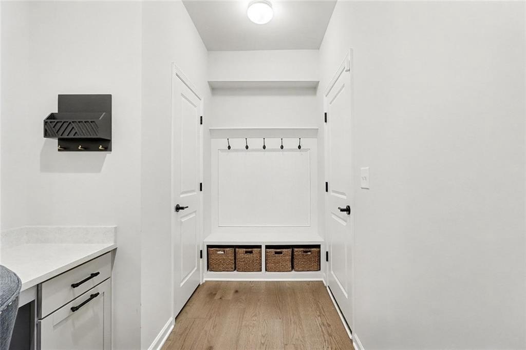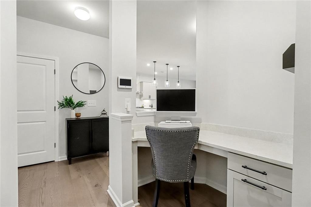 The private backyard overlooks serene trees, offering the perfect retreat. The built-in desk at the garage/owner's entry and the built-in coat rack with storage bins are practical touches for organization.