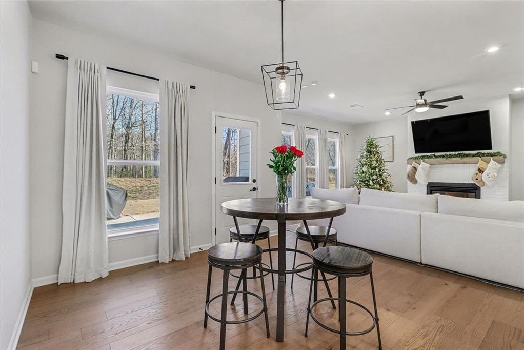 Upon entry, you’ll be greeted by a formal dining room with a beautiful tray ceiling, setting the tone for the rest of this thoughtfully designed home. The white gourmet kitchen is a chef’s dream, equipped with stainless steel appliances, including a combination microwave/wall oven, a large island, and a breakfast area. A Butlers galley off the kitchen provides additional space for entertaining. Adjacent to the kitchen, you have additional dining space and the inviting living room features a stunning tile-surround gas fireplace with a stylish gray wood mantle, perfect for cozy nights.