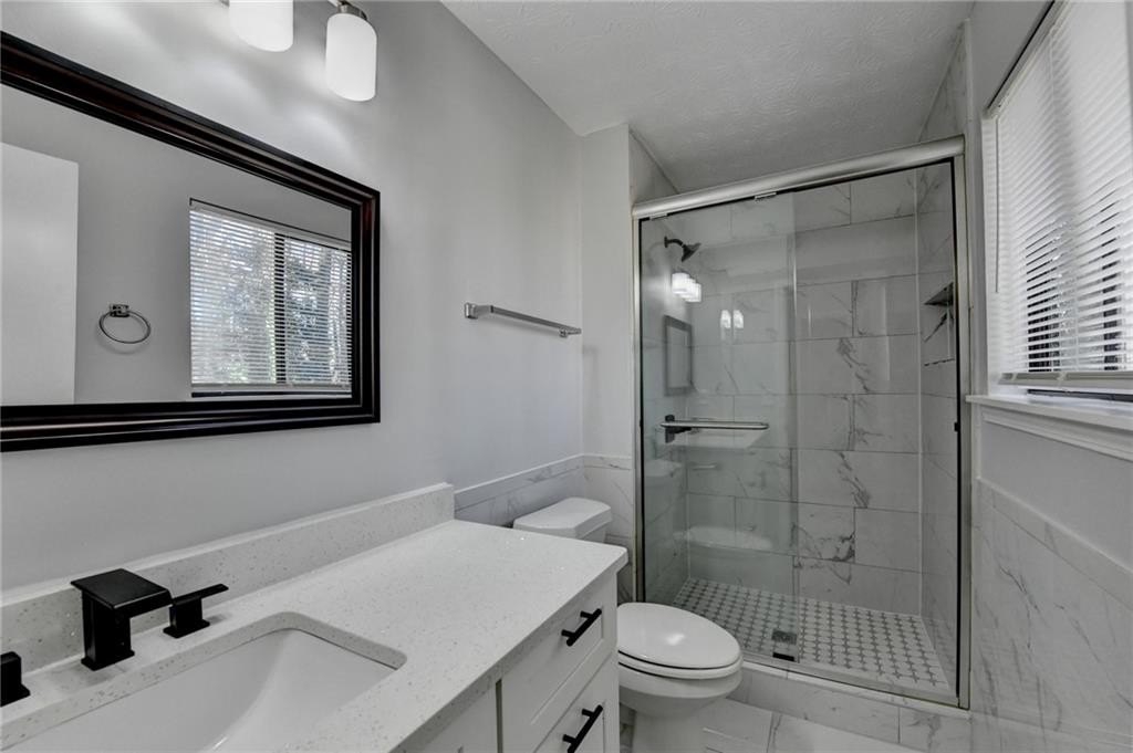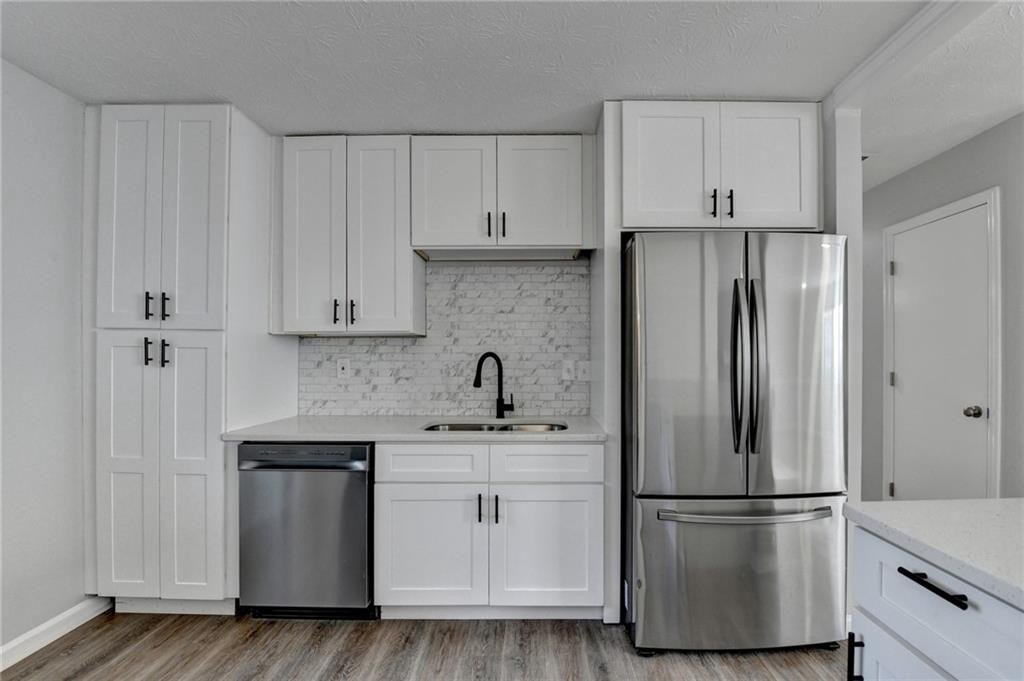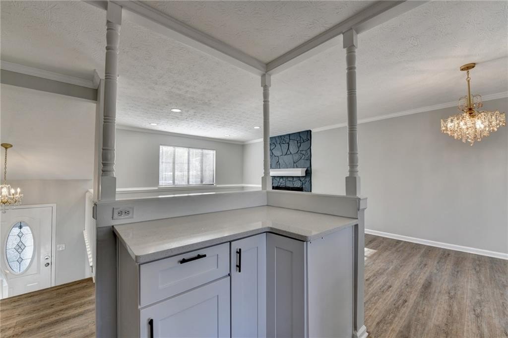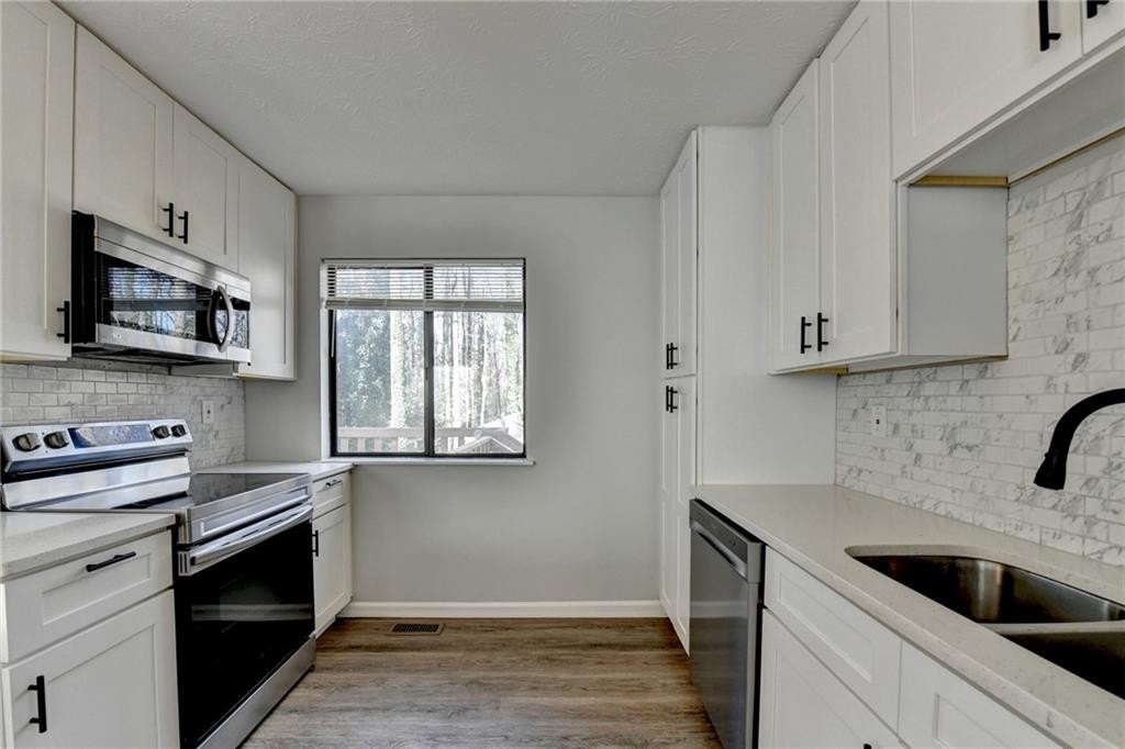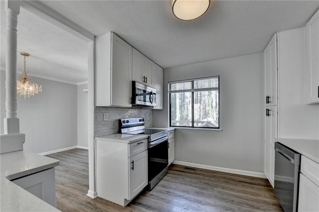 Beautifully remodeled split-foyer home featuring dual kitchens and a bright eat-in main kitchen with new quartz countertops, classic white subway tile backsplash, white cabinetry, and stainless-steel appliances. A separate formal dining room provides the perfect space for family gatherings and entertaining. The cozy family room showcases a vaulted ceiling and opens to the back deck, ideal for year-round enjoyment.
