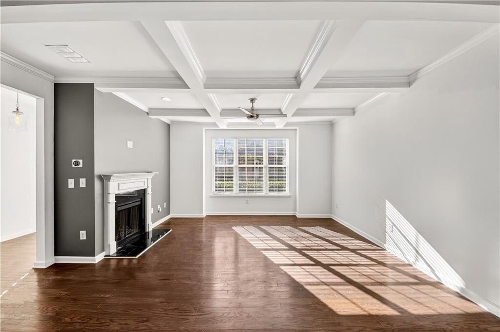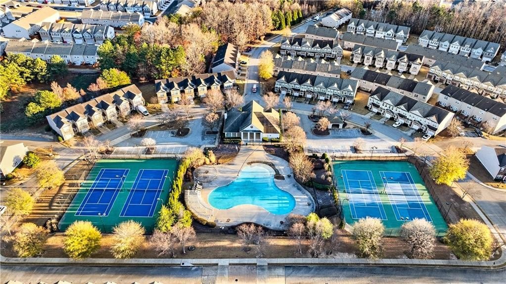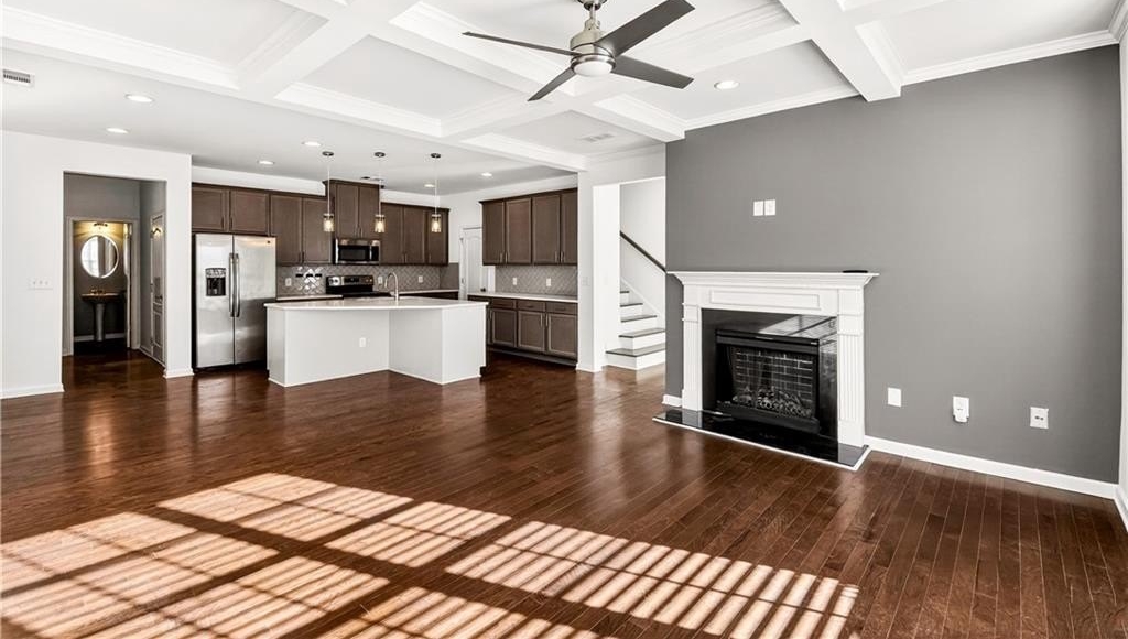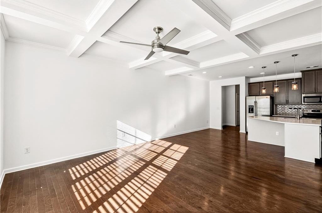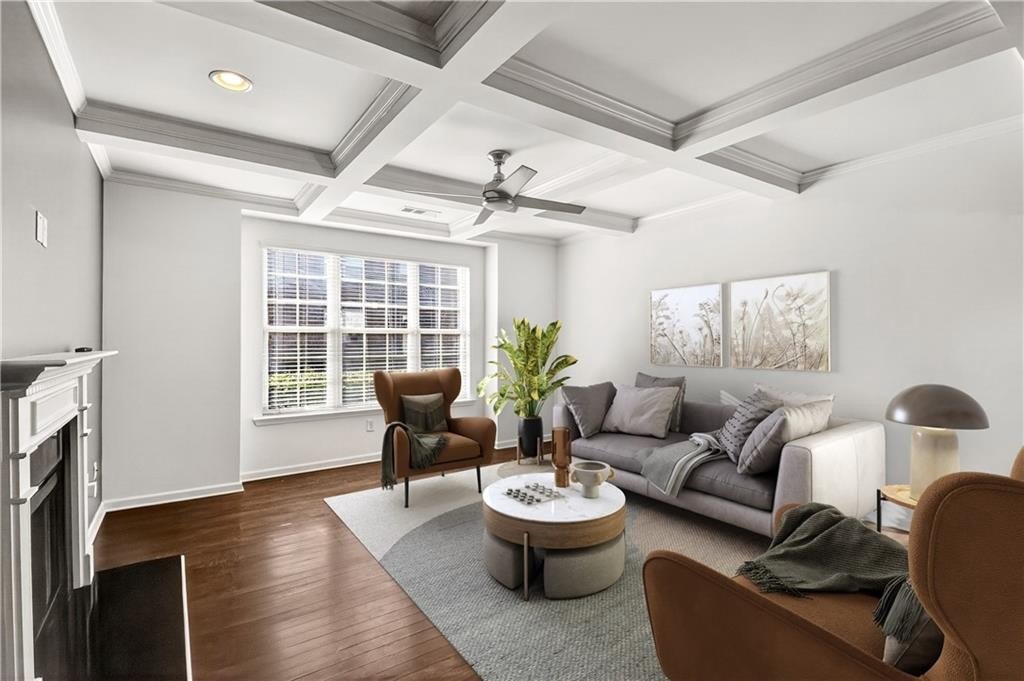 This spacious two-level, practically new 3 bedroom, 2.5 bathroom townhome has been freshly painted and updated, offering a sophisticated lifestyle in a highly convenient location. The open main level welcomes you with an open-concept living room featuring elegant coffered ceilings and a cozy fireplace. The gorgeous chef's kitchen is fully equipped with quartz countertops, stained cabinetry, stainless steel appliances, and a massive walk-in pantry. The large eat-in island is perfect for morning coffee or casual entertaining, while a convenient half-bath completes the first floor. Upstairs, the oversized landing serves as a versatile bonus area, ideal for a home office, den, or playroom. Behind double French doors lies the primary suite, a true retreat showcasing a dramatic accent wall, tray ceilings, and a tranquil ensuite. You'll love the dual vanity, deep soaking tub, and the sleek glass-enclosed shower. The two additional bedrooms share a hall bath. One guest room features private balcony access, offering a welcome outdoor escape to enjoy the fresh air. Additional features include a two-car garage and plenty of storage throughout. Living here means more than just a beautiful home; you'll have access to fantastic community amenities including a pool, clubhouse, and tennis courts. Convenient to 85, the airport, and shopping in the immediate vicinity, you'll settle in and love the neighborhood! Some photos have been virtually staged.