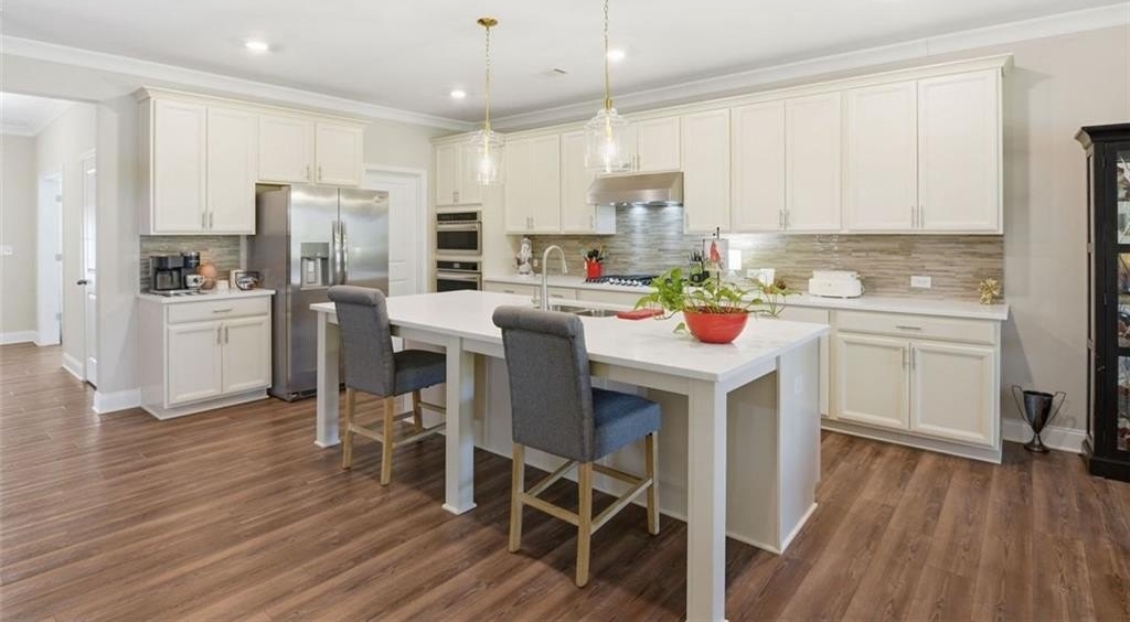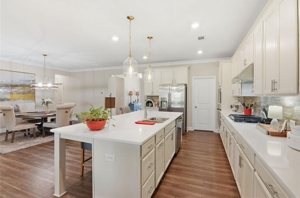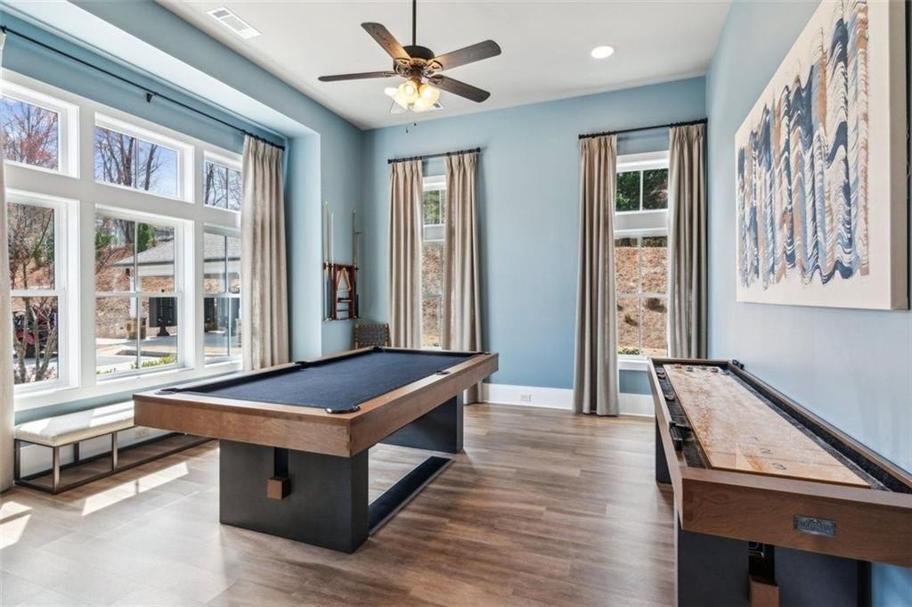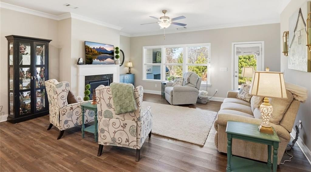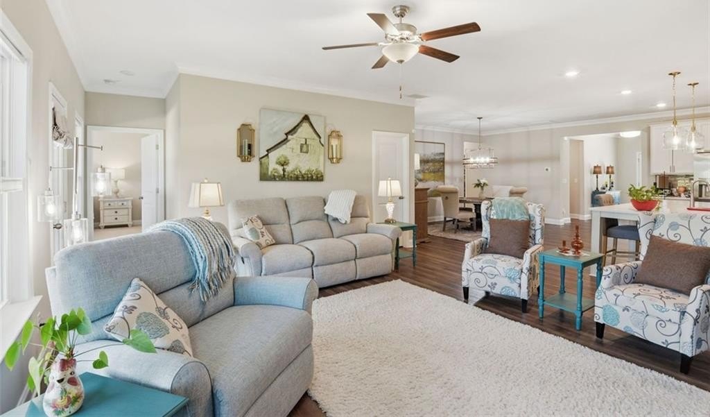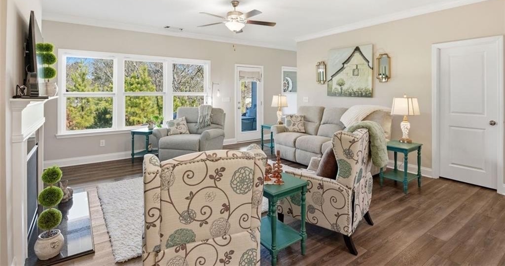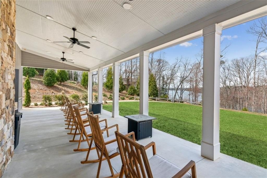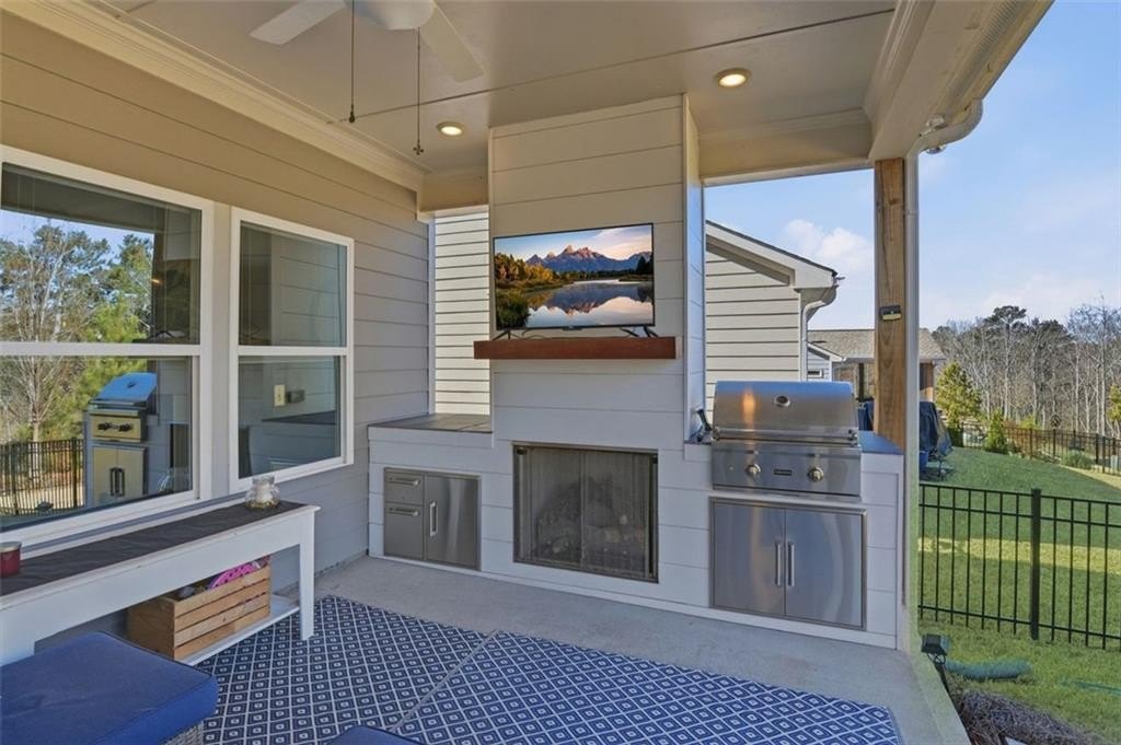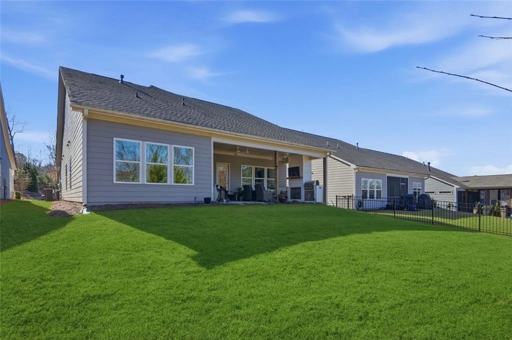 Welcome to Stephens Point, the sought-after gated 55+ community on Lake Lanier. This home offers one of the larger 2 bedroom layouts in the neighborhood. You enter from a rocking chair porch into the open plan with LVP flooring. At the front of the home, there is an office with glass French doors that brings in natural light and offers a useful space for work or hobbies. The upgraded kitchen gives you granite counters, an oversized island, a coffee bar, stainless steel appliances, and 42 inch cabinets. The large walk-in pantry offers plenty of shelving and storage. The serene primary sits at the back and offers lots of space and a peaceful bathroom with a tiled walk-in shower, dual vanities and access to a generous walk-in closet. The secondary bedroom sits away from the primary suite for privacy and has easy access to a second full bath. The functional mudroom area includes built in cabinetry and sits off the garage entry. Outdoor living here really stands out, there is a covered back patio with an extended pad offering space for seating and dining. A new custom outdoor setup includes a shiplap fireplace, direct gas line to a Coyote grill, built in storage drawers, and a mantel ready for a TV. This area is perfect for daily use and entertainment. The home offers custom blinds on every window plus smart features, these include Flo by Moen water shut off at the water heater, a Ring doorbell camera, Schlage Smart Lock at the front door, and My Q garage access. The lot sits on a cul de sac and backs to trees and the lakeside for privacy. The exterior is HardiePlank Fiber Cement siding. Amenities include a clubhouse, swimming pool, sports court, sidewalks, and lake access with a covered community dock offering 14 slips for resident use. This neighborhood truly offers a relaxed feel with friendly streets and resort style amenities. The convenient location places you near marinas, parks, shopping, dining and the highway!