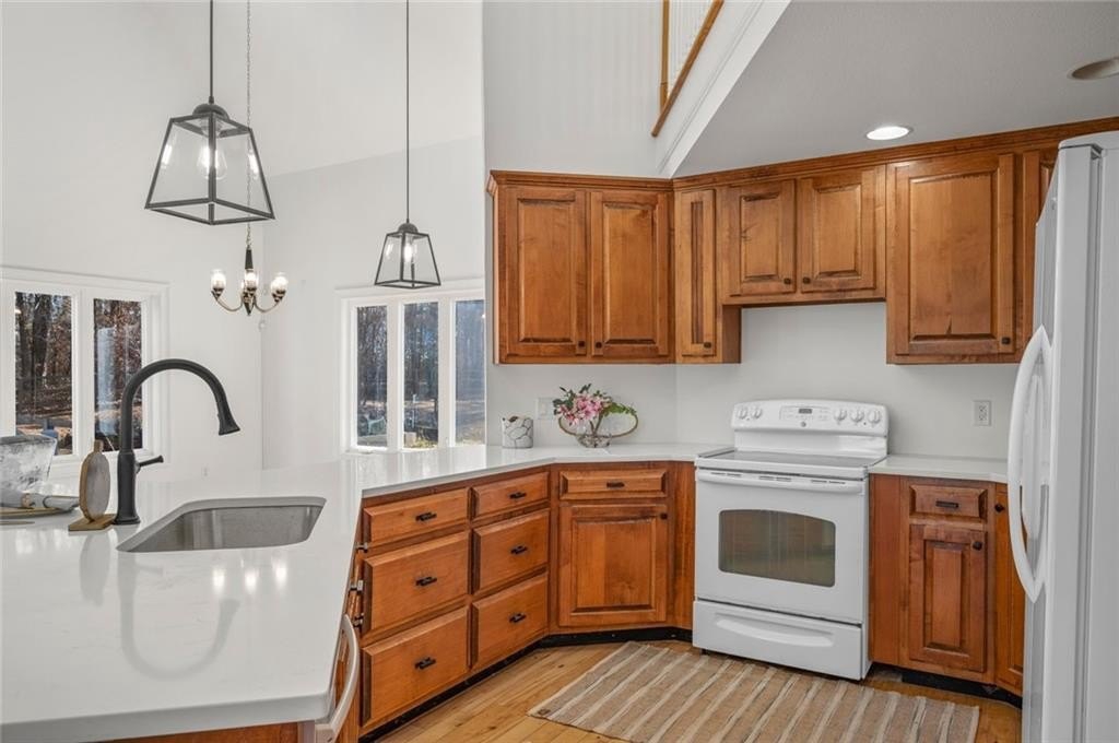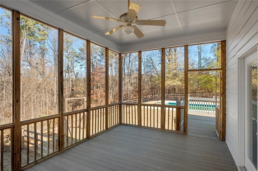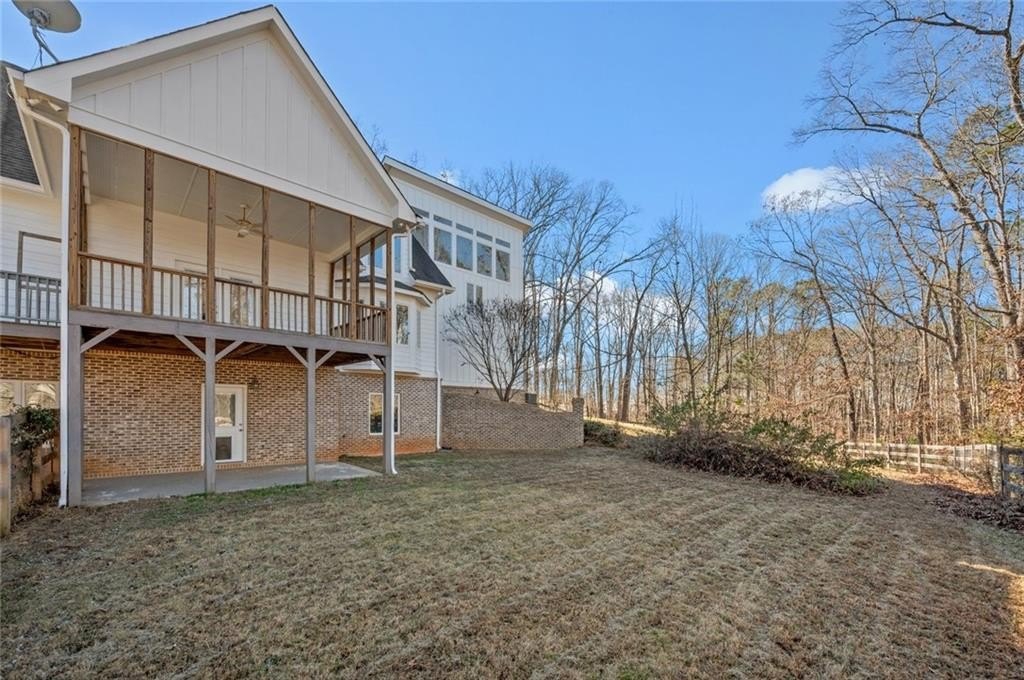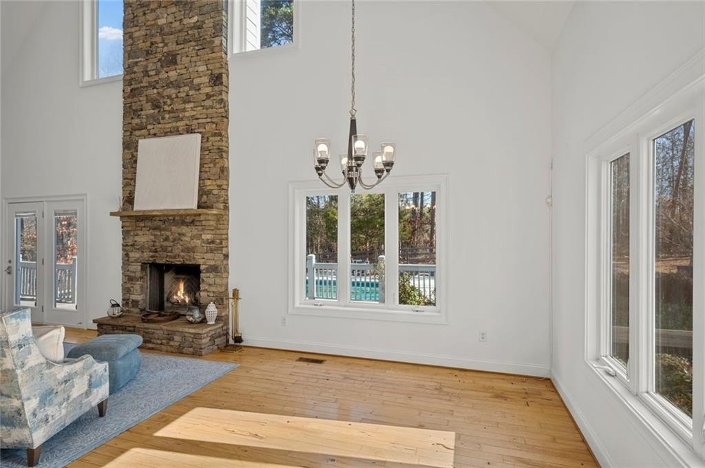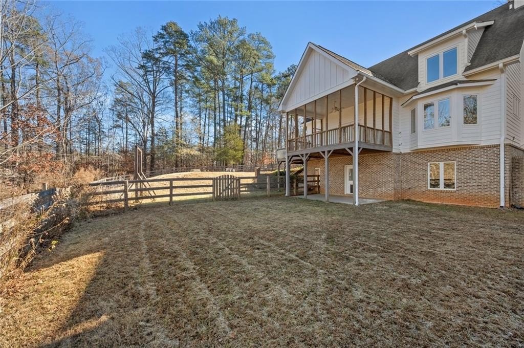 Great private retreat on 5 acres Convenient to Milton and Alpharetta for great shopping and dining. Top rated Cherokee County schools. Lots of outdoor space from the big deck overlooking the oversized inground pool, to several large fenced in area for play and for pets, plus a charming front yard platform deck setting to relax and enjoy nature and sunsets. The main living area features a 2-story vaulted ceiling with stacked stone fireplace facade, tons of natural light throughout, open concept dining space, with patio doors opening to the side deck and back porch, with views to the pool area. The kitchen has great cabinet and counter space and also opens to the living area. Super master on main with a luxurious master bath featuring a double vanity and oversized shower, plus a divine walk-in closet. The second floor features another bedroom and full bath, plus a grand two story artist studio, game room, ball room, or home office space with a separate walkup exterior entrance - guest or teen suite deluxe. The terrace level has a full bath, two possible bedroom spaces, plus a rec/entertainment area and walkout access to the backyard. Guest bed and bath options at the second floor and terrace levels. This is not your "cookie cutter" home. Tons of natural light throughout. Amazing land and setting for this price on a street of multi-million dollar homes on much smaller lots with less privacy.
