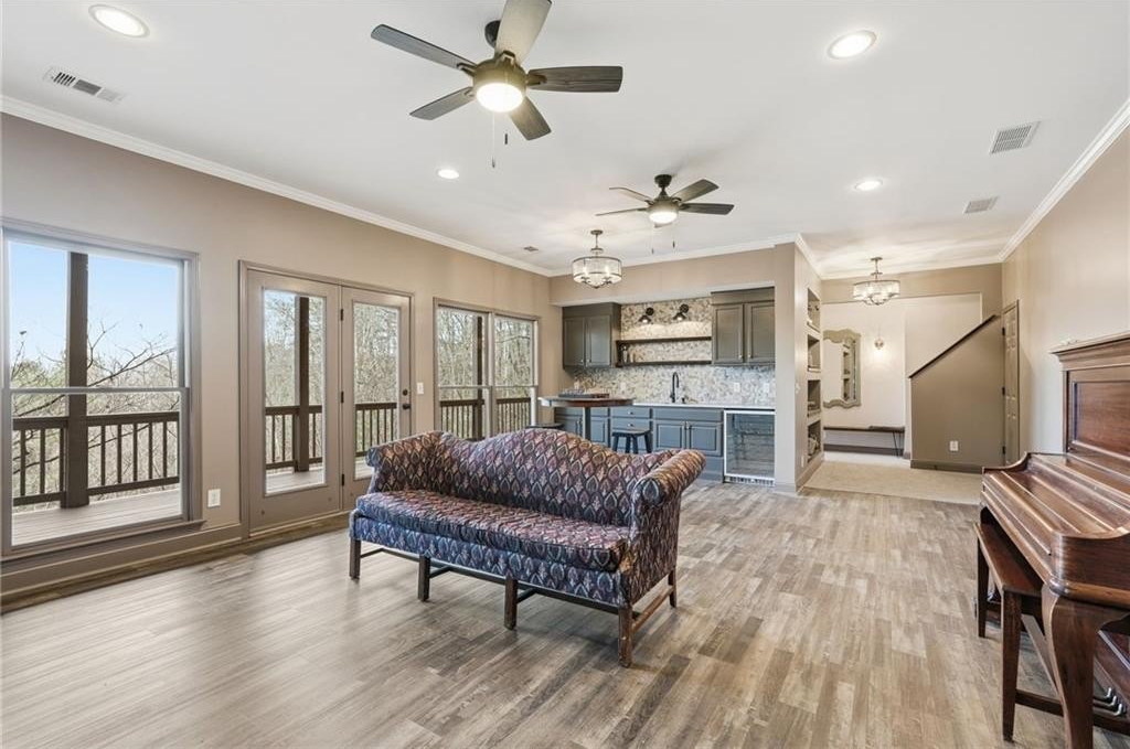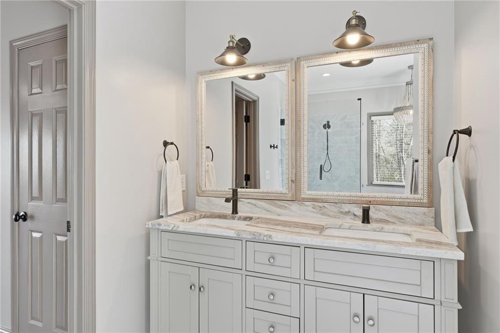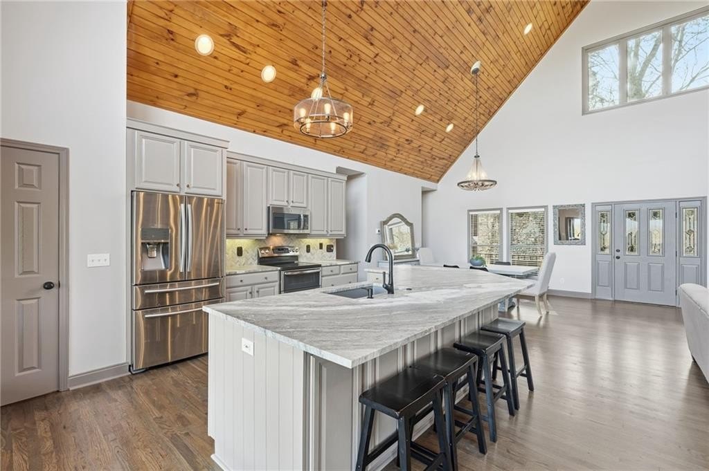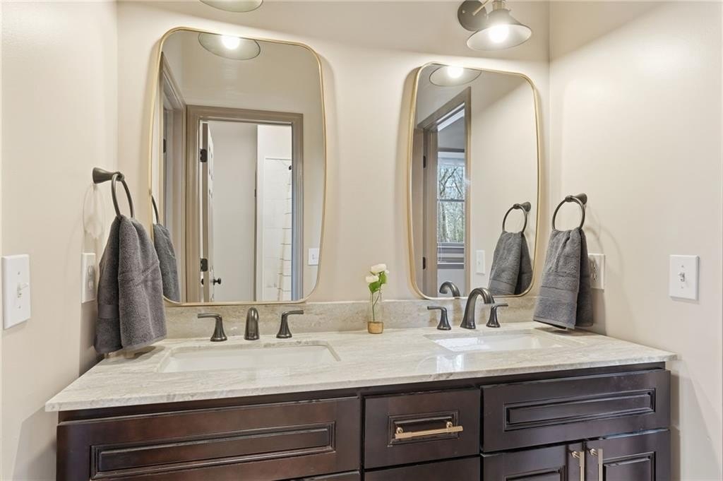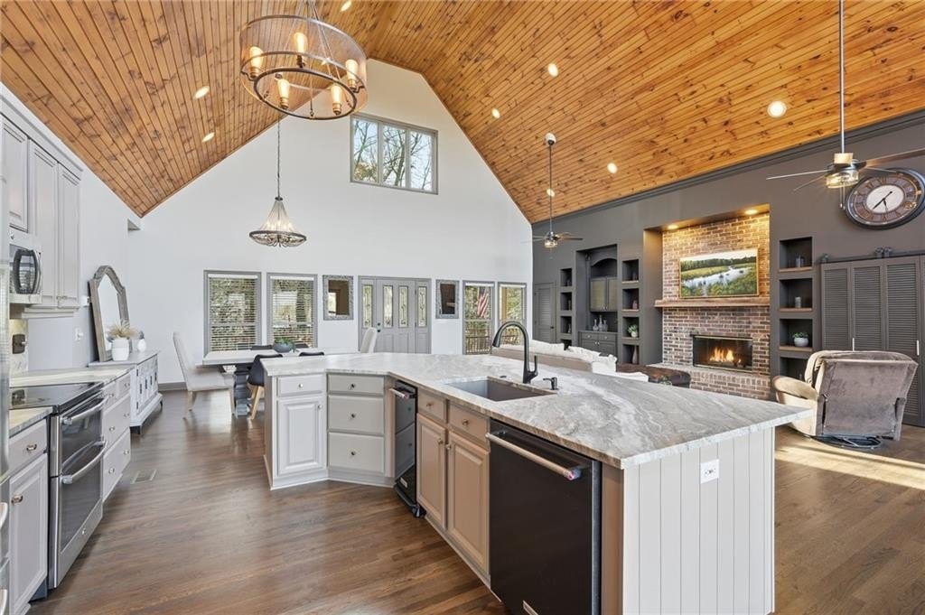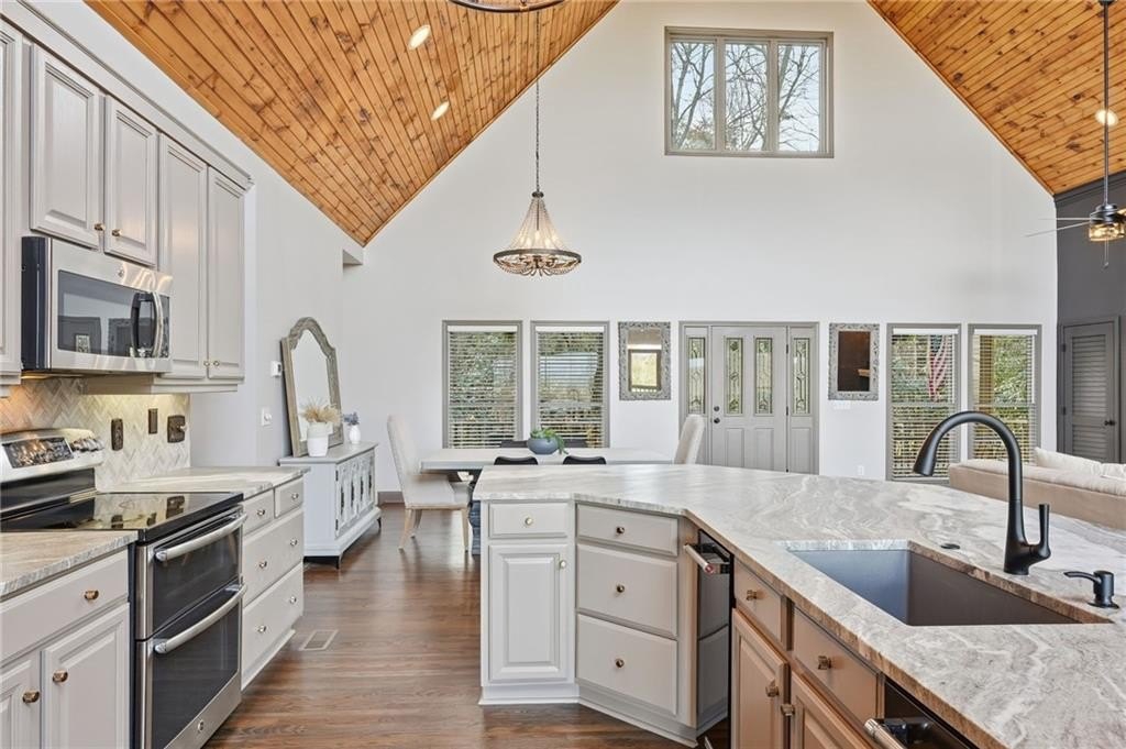 This beautifully transformed mountain home with long range mountain views including Amicalola Falls is ready to welcome you home. Set on 2.42 private acres, this thoughtfully renovated property has been completely updated with every room touched, offering move in ready condition and timeless mountain style. The main level features two large bedrooms, each with en suite bathrooms, including a primary suite with a cozy fireplace that creates a warm and inviting retreat. The open concept kitchen has been updated with leathered granite countertops, an island perfect for gathering, and flows seamlessly into the extra large family room featuring sleek custom built in shelving and refinished and newly installed hardwood floors. New carpet throughout the home, all new bathroom fixtures, and new lighting throughout enhance the fresh, modern feel. Vista pruning has opened the expansive mountain views, allowing you to enjoy the natural beauty from both levels of the home. The terrace level offers a spacious family room with a third fireplace, a wet bar with wine cooler ideal for entertaining, two bedrooms with a Jack and Jill bathroom, and two additional flex rooms perfect for an office, gym, playroom, or extra sleeping space. One flex room includes a private bath and separate exterior entrance with stairway access, making it ideal for an adult child, caregiver, or au pair suite. Two laundry rooms, one on each level, add convenience to daily living. Expansive decks on both levels and a screened porch on the main level provide wonderful outdoor living space for relaxing and watching the wildlife. With new systems throughout, this home is centrally located near Lake Petit and community amenities and is just 5 to 7 minutes from the north gate with multiple access routes, making this mountain retreat easy to love, easy to live in, and truly a place that feels like home. If your agent is not able to show this home to you, no worries. I am happy to show my listings as a courtesy to your agent. Buyer to verify all information and dimensions deemed important.