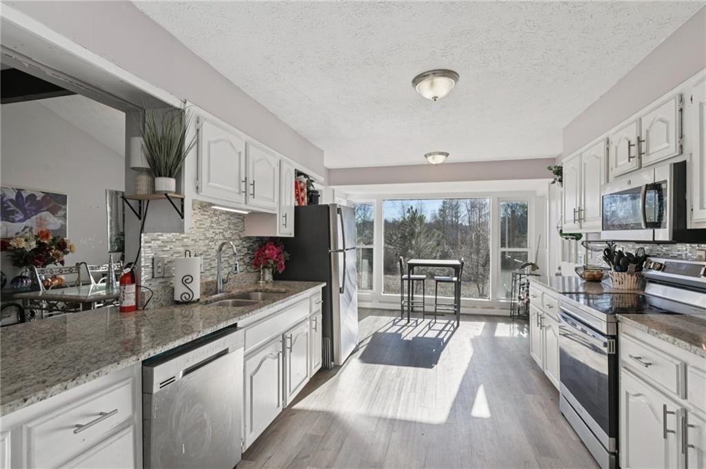 Bright and inviting 4-bedroom, 2-bath split-level nestled in Douglasville! This home shines with an updated white kitchen featuring stone countertops, perfect for everyday living and entertaining alike. Tons of natural light flow throughout the home, highlighting the fireside family room with vaulted ceilings and striking wood beams, creating a warm and inviting gathering space. Enjoy a flex room that can be used as a second living room, home office, media room - you name it! The primary suite offers a walk-in closet and comfortable retreat. Step outside to enjoy the large covered deck overlooking a fenced backyard with mature trees. An in-ground pool is on site and ready for restoration, providing an opportunity to create your ideal summer retreat. With two fenced and gated yards, the possibilities are endless! A wonderful blend of comfort, character, and outdoor living-this home is a must-see! Book your tour today!